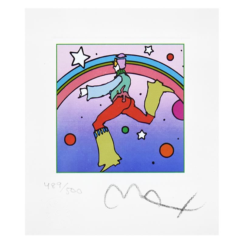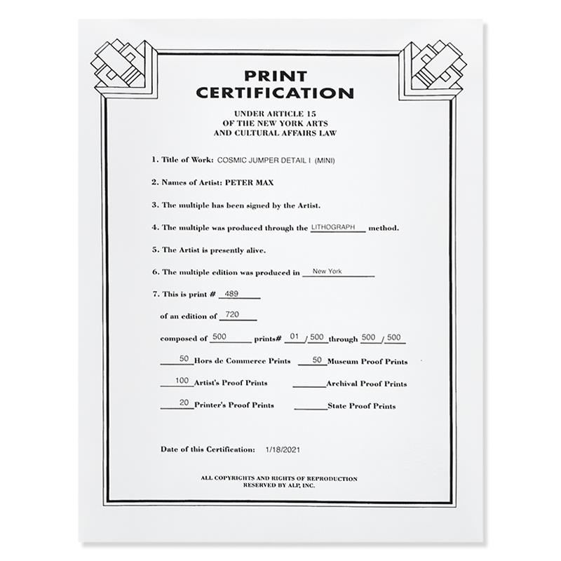 "Cosmic Jumper Detail I" is a limited edition lithograph on paper by Peter Max, numbered 489/500 and hand signed by the artist. This piece comes framed and includes Certificate of Authenticity from Peter Max Studios. Measures approximately 17" x 16 (frame
