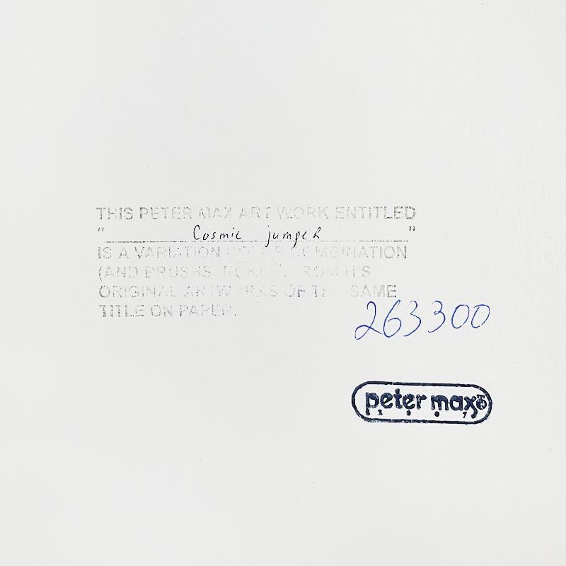 "Cosmic Jumper" is a one-of-a-kind acrylic mixed media on paper, hand signed by Peter Max. The piece comes custom framed with a backside cutout to display Peter Max Studio registration number 263300 certifying authenticity. Measures approx. 30" x 26" (frame), 17" x 13" (image).