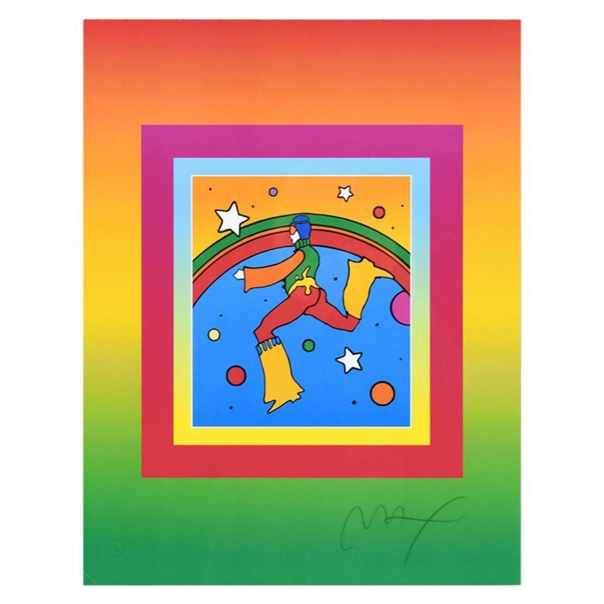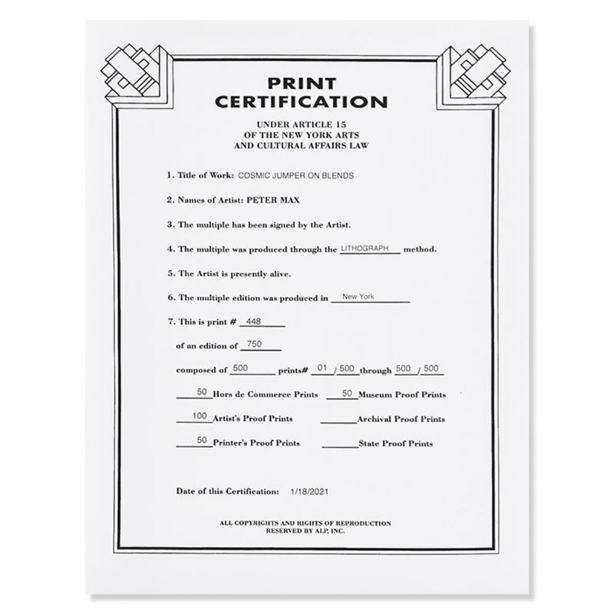 Cosmic Jumper on Blends by Peter Max. "Cosmic Jumper on Blends" is a limited edition lithograph on paper by Peter Max, numbered 448/500 and hand signed by the artist. This piece comes framed and includes Certificate of Authenticity from Peter Max Studios. Measures approximately 31" x 27 (frame), 17" x 13" (image).