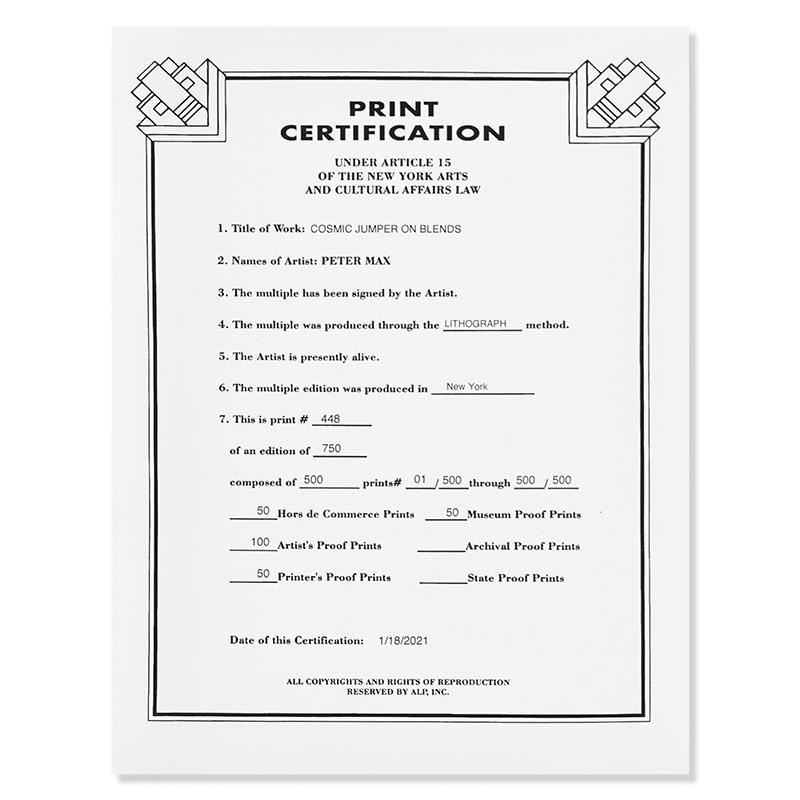 "Cosmic Jumper on Blends" is a limited edition lithograph on paper by Peter Max, numbered 448/500 and hand signed by the artist. This piece comes framed and includes Certificate of Authenticity from Peter Max Studios. Measures approximately 31" x 27 (frame), 17" x 13" (image).