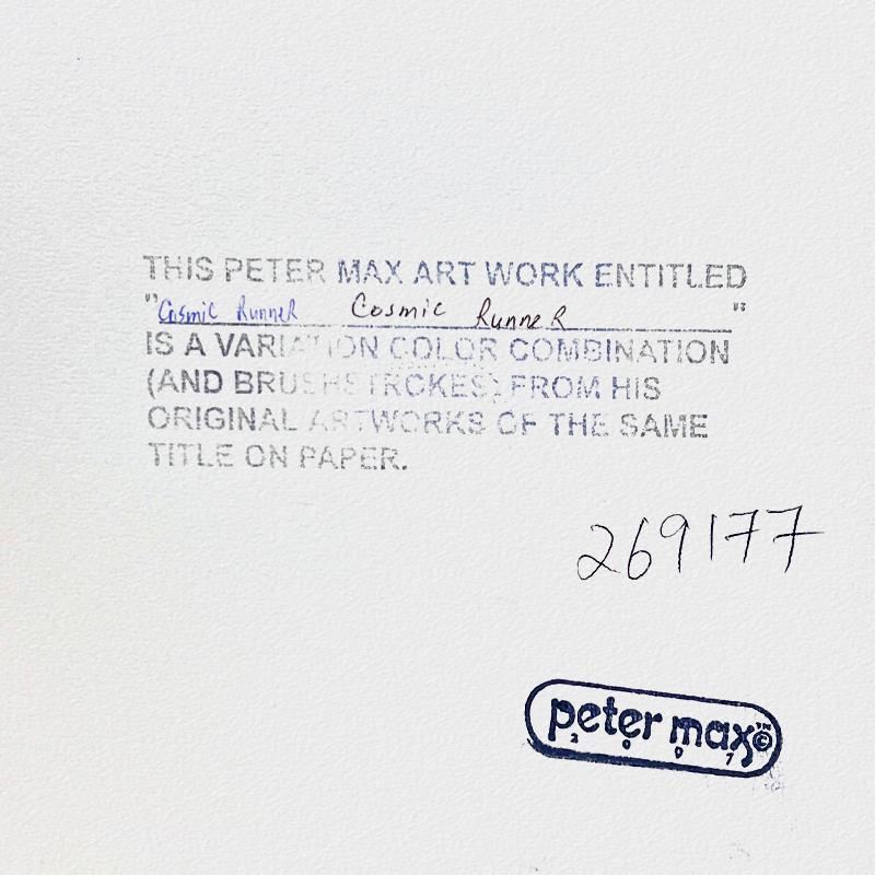 "Cosmic Runner" is a hand signed one-of-a-kind acrylic mixed media on paper by Peter Max. The piece comes custom framed with a backside cutout to display Peter Max Studio registration number 269177 certifying authenticity. Measures approximately 30" x 26" (frame), 17" x 13" (image).