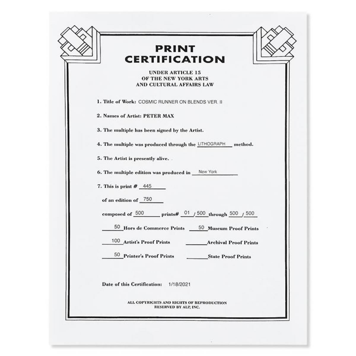 "Cosmic Runner on Blends Ver II" is a limited edition lithograph on paper by Peter Max, numbered 445/500 and hand signed by the artist. This piece comes framed and includes Certificate of Authenticity from Peter Max Studios. Measures approximately 30.5" x 26.5 (frame), 17" x 13" (image).