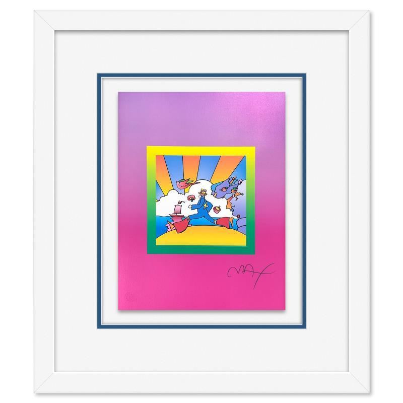 Cosmic Runner on Blends Ver II is a limited edition lithograph on paper by Peter Max, numbered and hand signed by the artist. This piece comes framed. Includes Certificate of Authenticity from Peter Max Studios. Measures approx. 27 x 23 (frame), 17 x 13 (image).
