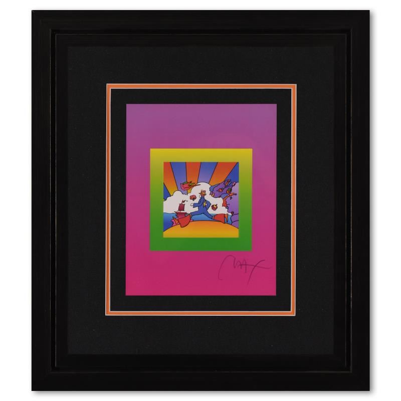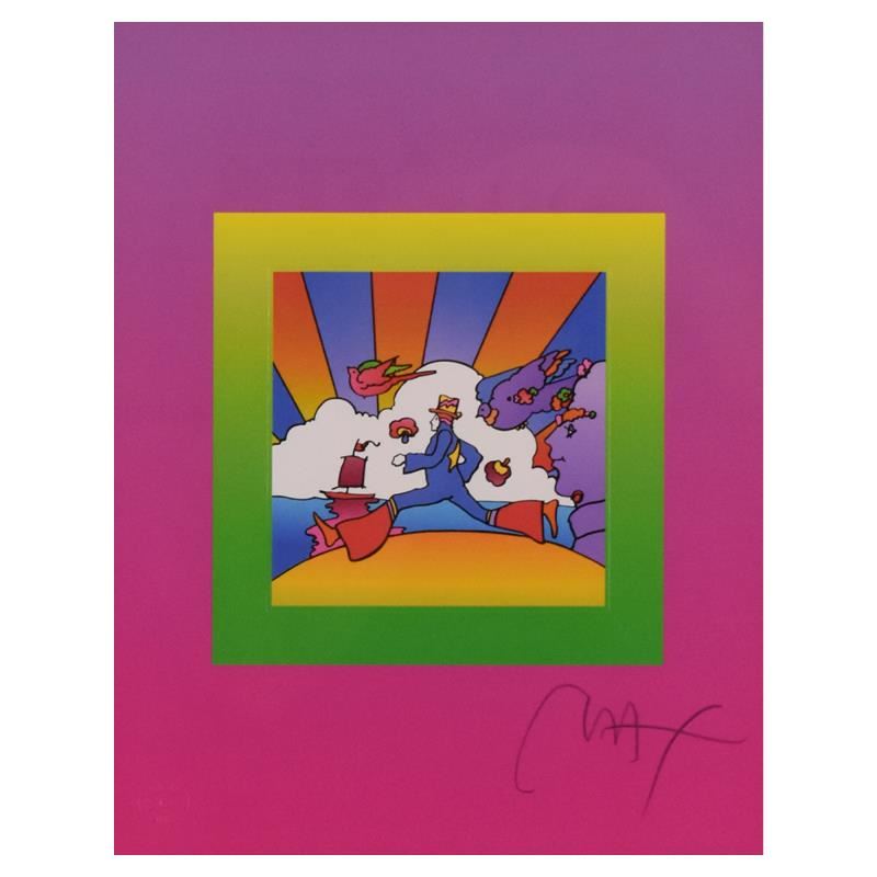 "Cosmic Runner on Blends" is a limited edition lithograph on paper by Peter Max, numbered 494/500 and hand signed by the artist. This piece comes framed. Includes Certificate of Authenticity from Peter Max Studios. Measures approximately 22.5" x 25" (frame), 10" x 13" (image).