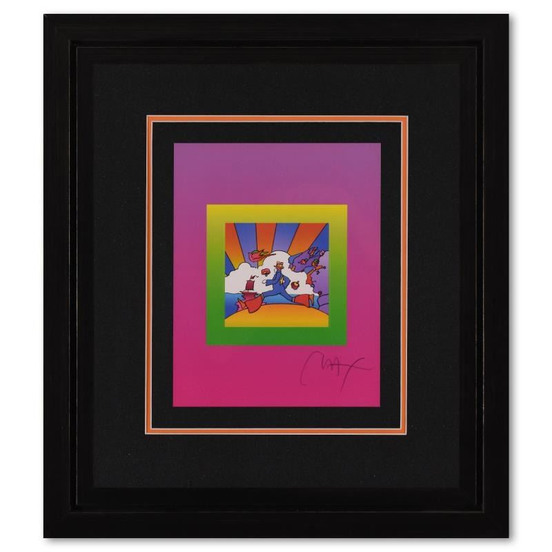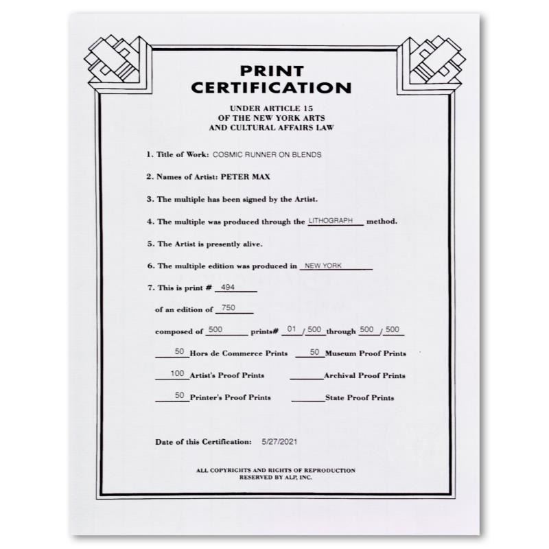 "Cosmic Runner on Blends" is a limited edition lithograph on paper by Peter Max, numbered 494/500 and hand signed by the artist. This piece comes framed. Includes Certificate of Authenticity from Peter Max Studios. Measures approximately 22.5" x 25" (frame), 10" x 13" (image).
