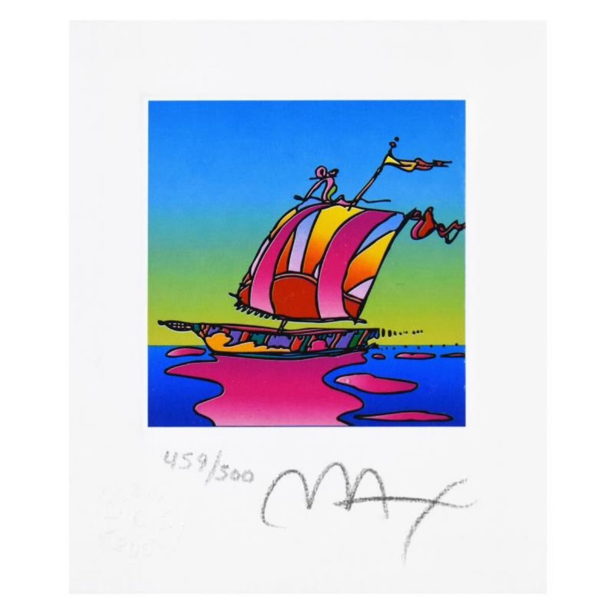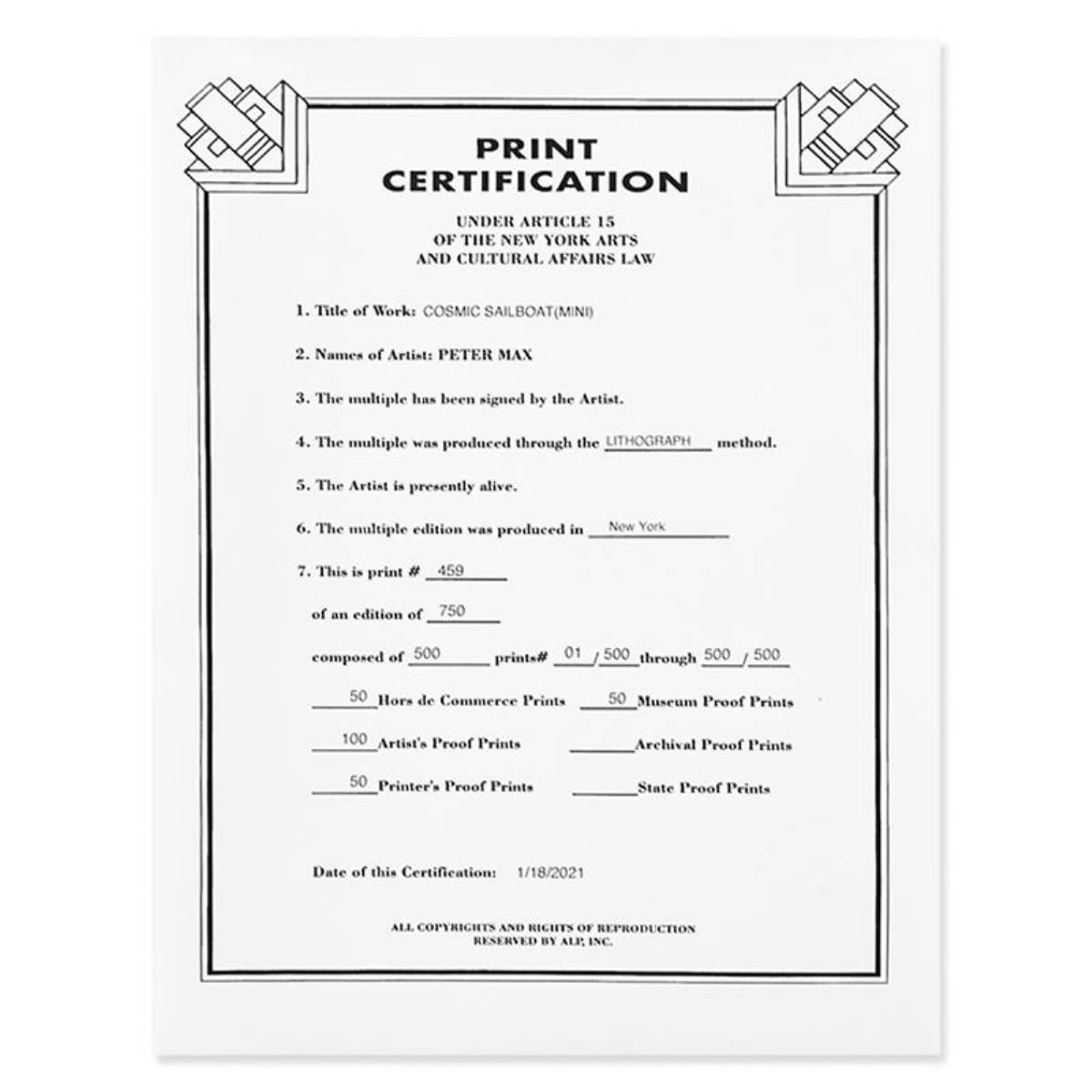 Cosmic Sailboat by Peter Max. "Cosmic Sailboat" is a limited edition lithograph on paper by Peter Max, numbered 459/500 and hand signed by the artist. This piece comes framed and includes Certificate of Authenticity from Peter Max Studios. Measures approximately 17.5" x 16.5 (frame), 3" x 3" (image).