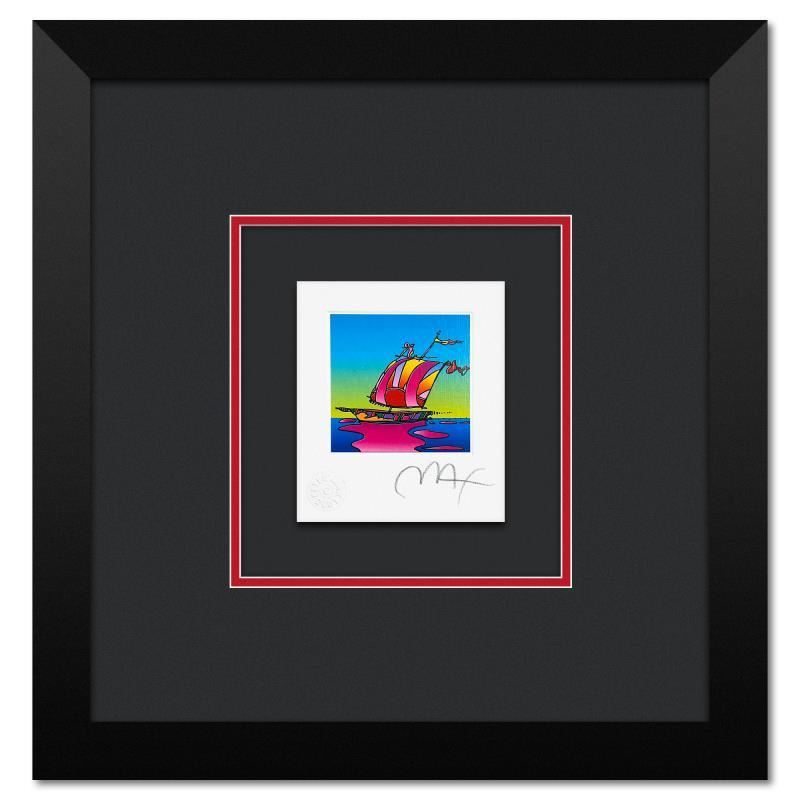 "Cosmic Sailboat" is a limited edition lithograph on paper by Peter Max numbered and hand signed by the artist. This piece comes framed. Includes Certificate of Authenticity from Peter Max Studios. Measures approx. 13" x 13.5" (frame) 3" x 3.5" (image).
