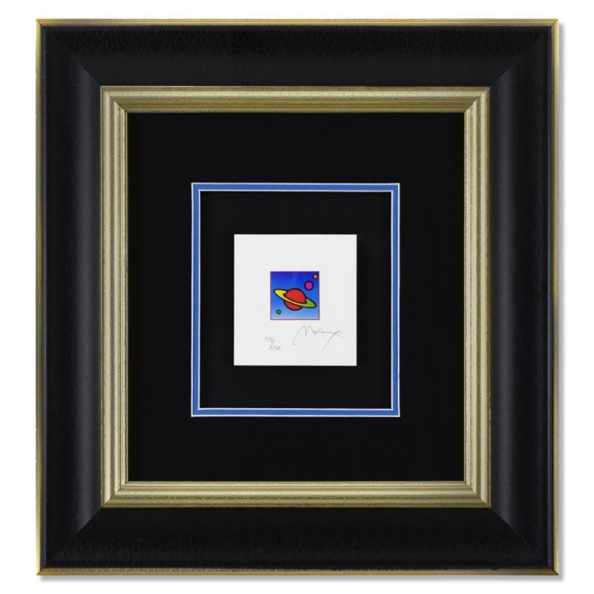 Cosmic Saturn II by Peter Max. "Cosmic Saturn II" is a limited edition lithograph on paper by Peter Max, numbered 496/500 and hand signed by the artist. This piece comes framed and includes Certificate of Authenticity from Peter Max Studios. Measures approximately 19.5" x 20.5 (frame), 4" x 5" (image).