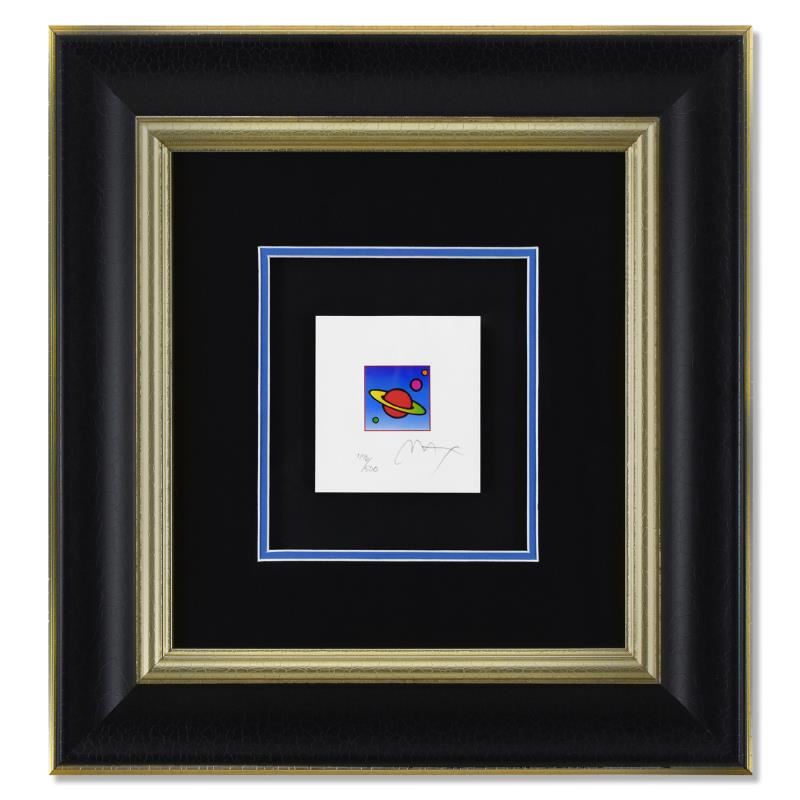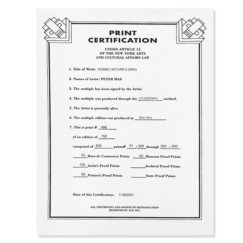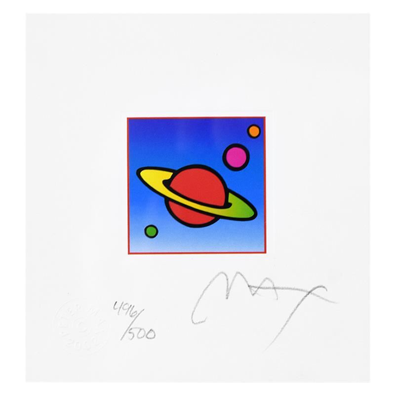 "Cosmic Saturn II" is a limited edition lithograph on paper by Peter Max, numbered 496/500 and hand signed by the artist. This piece comes framed and includes Certificate of Authenticity from Peter Max Studios. Measures approximately 19.5" x 20.5 (frame), 4" x 5" (image).