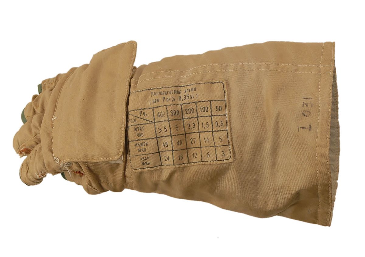 Right-hand glove from an Orlan EVA spacesuit, #8K-1-0890060, numbered and lettered in Russian and has the locking coupling. Glove is complete with an outer thermal-insulated nylon canvas, pebbled rubber palm and finger pads, rounded blue rubber fingertips, two Velcro flaps above the knuckles, and a table of pressure levels with coordinating minutes on the wrist. In very good condition, with wear and cracking to fingertips, as well as some wear and surface loss to leather portions of fingers and thumb. Provenance: Odyssey Auction, March 1995.