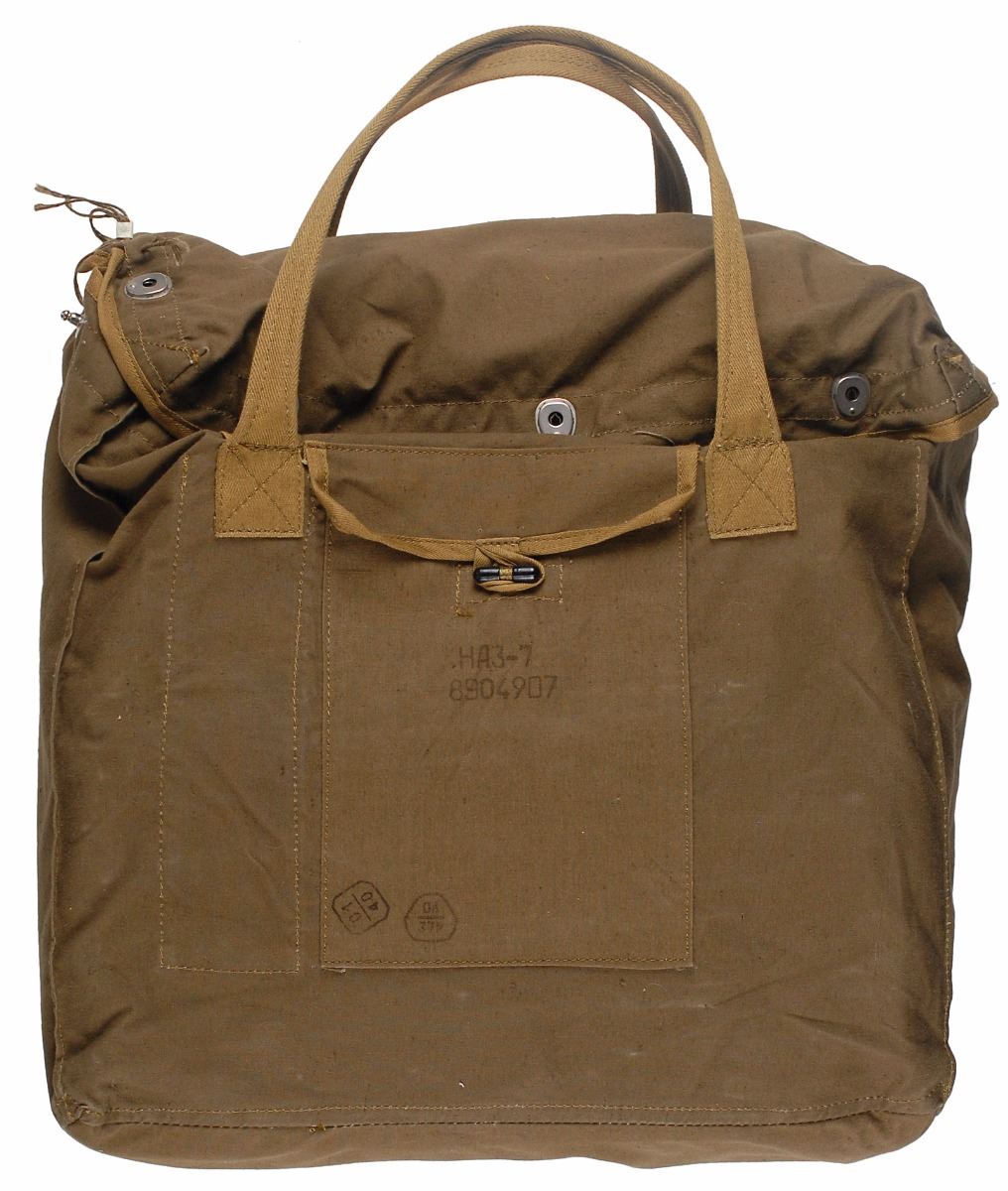 An interesting cosmonaut pilot survival kit contained within an olive drab canvas bag, stamped on the front with part numbers, "HA3-7, 8904907." The main kit is inside a removable interior pouch that has the same part numbers stamped on the front, with several survival materials held within the form-fitting foam case by thick gray elastic bands. Items in this kit include: a looped razor-wire saw, a compass, fishing equipment, a medical kit, boxes for flares and bullets (empty), flashlight, matches, signal mirror, a plastic box for crackers or other food, and other items. Other items in the large canvas bag include a pair of short folding metal skis and water purification supplies. A booklet inside the kit is dated 1989. Some items originally held within the case may no longer be present. In overall very good to fine condition. These survival kits were designed so that Soviet pilots would have the supplies necessary for survival in case of a crash landing. As bullets would have been included in this kit, the pilot would also have carried a gun—possibly the intriguing TP-82, a combination shotgun-machete designed for hunting, firing distress beacons, protection from the wolves and bears of Siberia and, potentially, as a defensive weapon against hostile foreign nationals. An unusual and fascinating discussion piece.