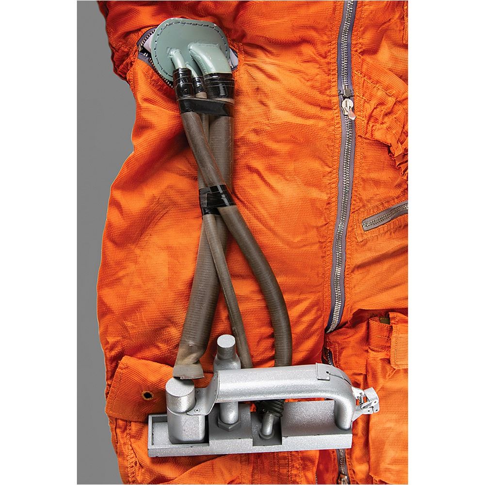 The suit torso, which has been fabricated from scavenged parts of Soviet high-altitude suits, has no pressure bladder and the umbilical connector is a solid resin casting replica. The bright orange load-bearing Lavsan outer layer, which allowed recovery helicopters to more easily spot the cosmonaut on the ground or in the water, is a factory-made reproduction that is missing the right arm mirror. The suit is missing the flotation bladder and hose, the gloves are replicas, and the boots are not SK-1 examples. Based on the materials and fabrication methods, the suit is clearly a low-fidelity reproduction for display. In very good to fine condition, with wear and fading to fabric, and noticeable wear and cracks to the helmet.