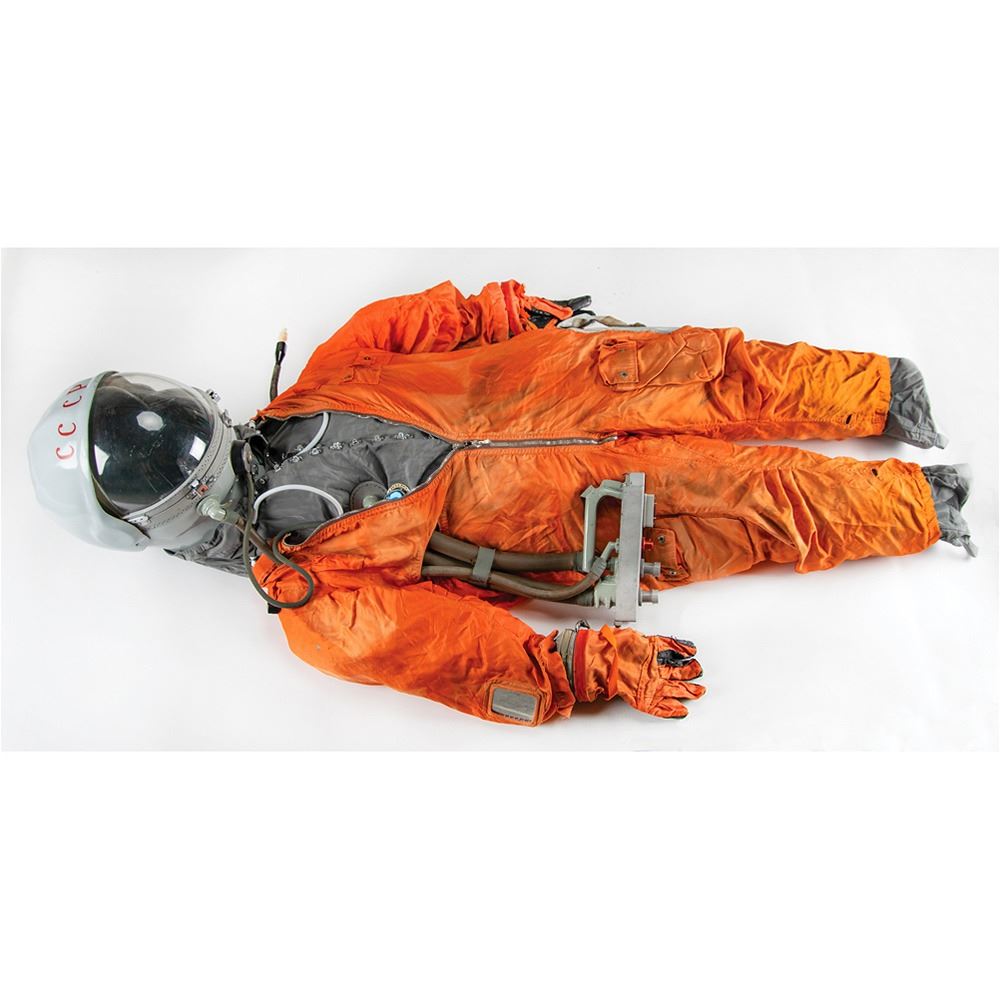 Display replica of the SK-1 spacesuit for the Vostok program, which succeeded in placing the first human into space, Yuri Gagarin, in a single orbit in Vostok 1 on April 12, 1961. As such, the SK-1 has the unique distinction of being the first spacesuit ever used and, subsequently, has served as the basis for all future pressure suits conceived for Soviet and American space programs alike. The SK-1 was successfully used by cosmonauts for all six Vostok missions between 1961 and 1963.