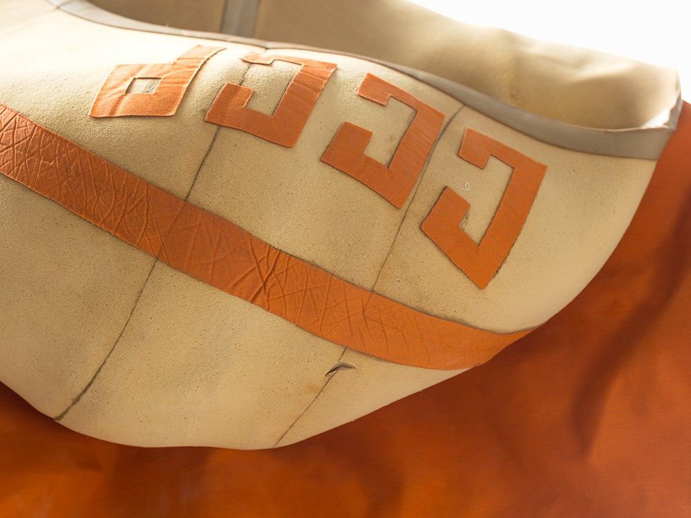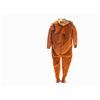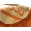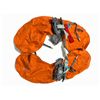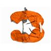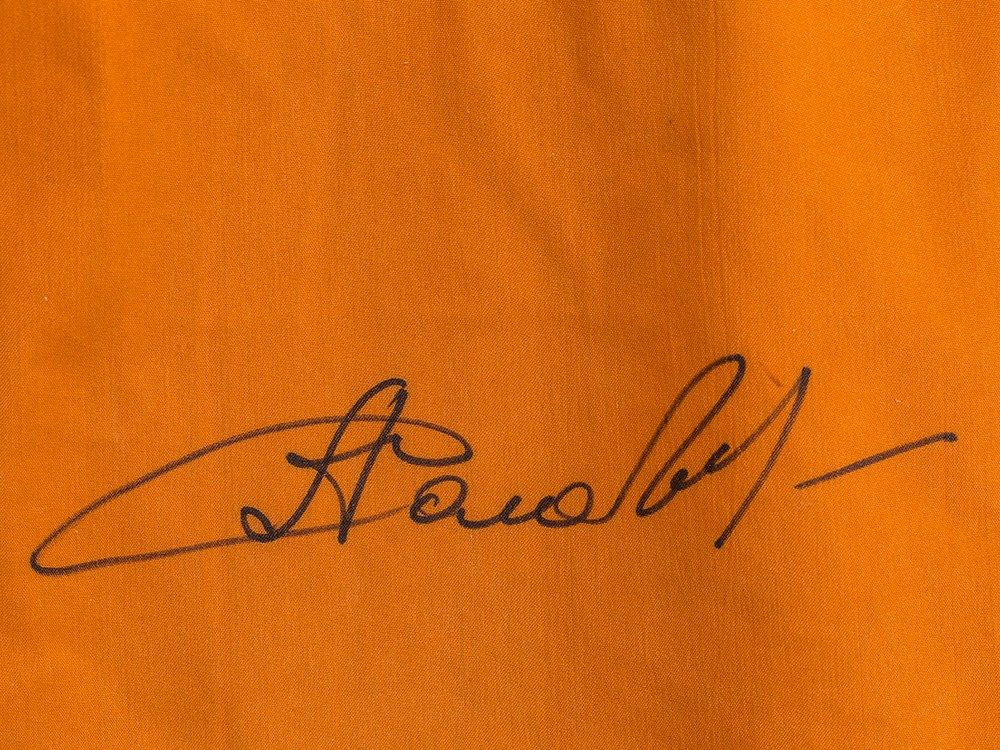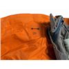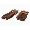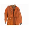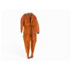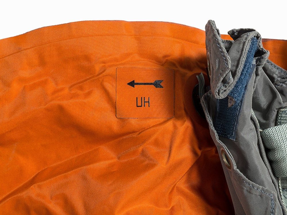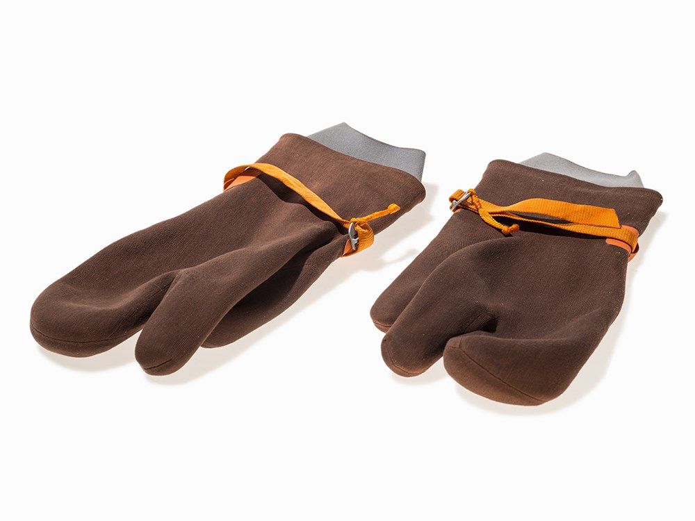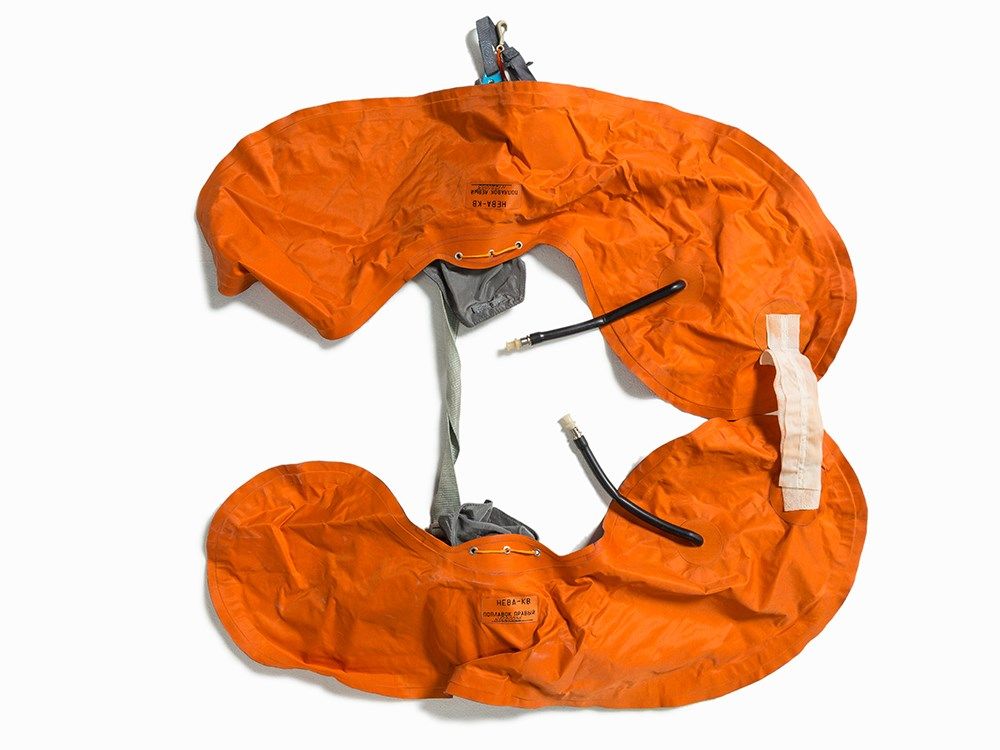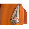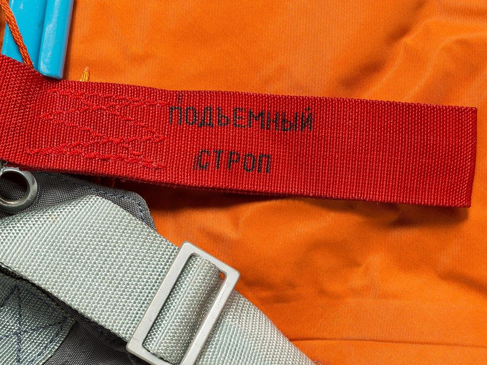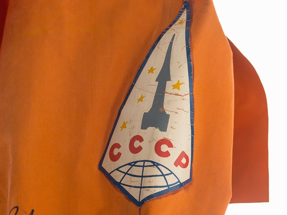 The present suit still possesses of the isolated brown mittens, as well as of the integrated inflatable west with inflation tube and mouthpiece. The rubberized nylon overall in orange has got a zipper in front. On the sides are two folded leg pockets with Velcro fastener. On top is a rubber hood that is inscribed with the letters ‘CCCP’. At the arm ends are grey, elastic rubber cuffs. The attached boots can be closed with rods that run through 36 eyelets. An emergency light is attached to the suit at chest height and the light is battery-powered. A triangular patch is attached to the left shoulder. This patch depicts a rocket starting from the earth as well as the lettering ‘CCCP’.
