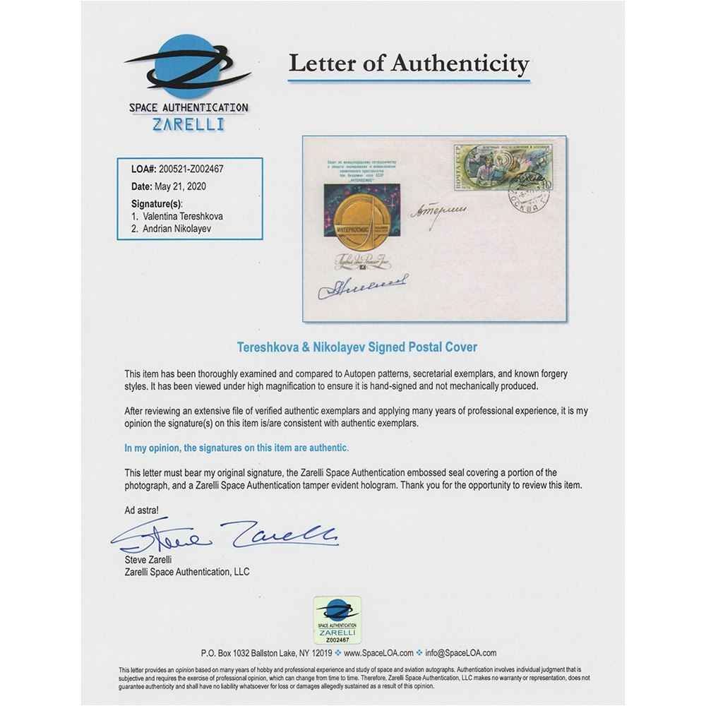 Three Soviet commemorative covers signed by cosmonauts, including: Valentina Tereshkova and Andrian Nikolayev; Valentina Tereshkova; and Gherman Titov. In overall fine condition. Accompanied by a full letter of authenticity from Zarelli Space Authentication for the twice-signed cover.