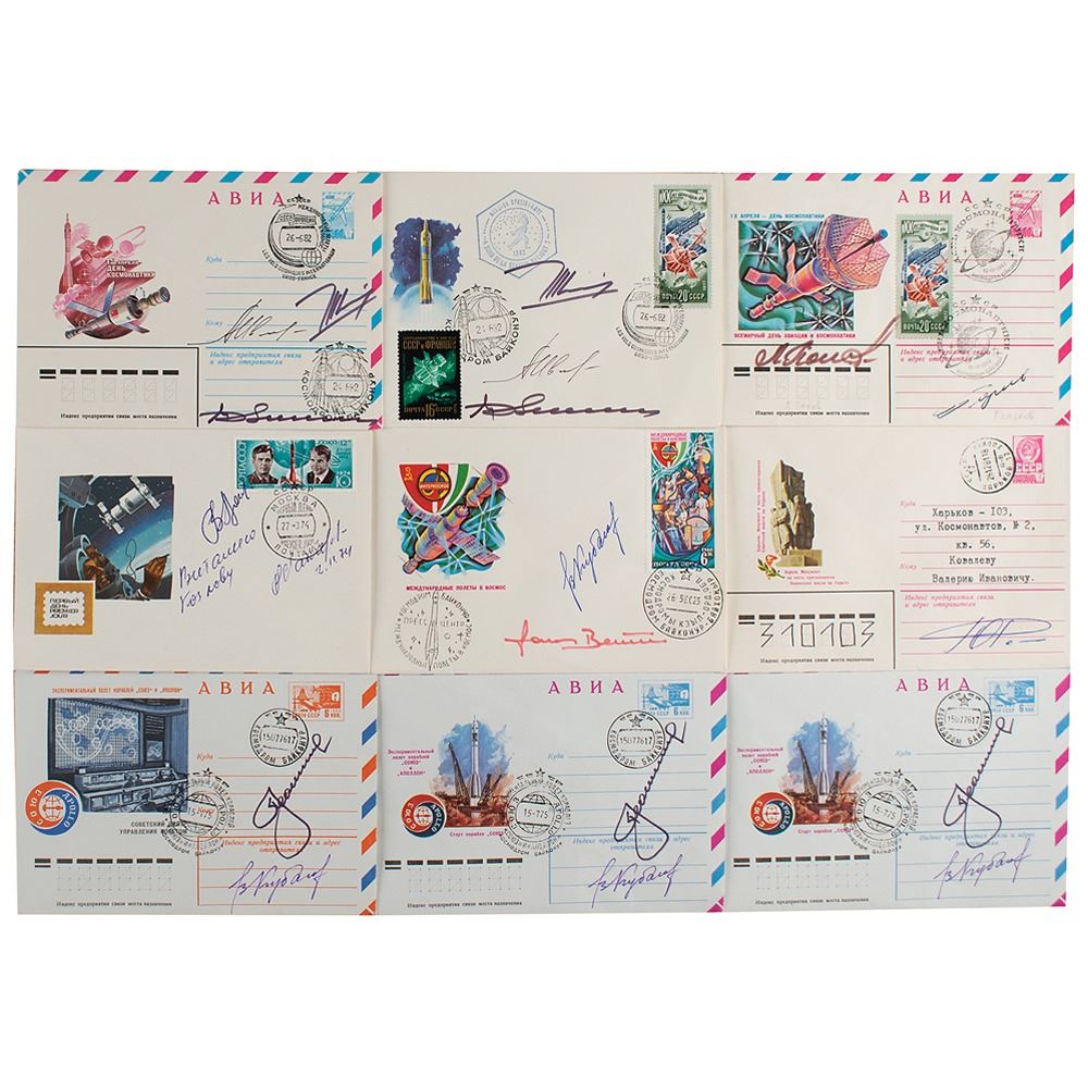 Nice collection of nine Soviet commemorative covers, each signed by one or more cosmonauts. Includes: Alexei Leonov and Valeri Kubasov (3); Valeri Kubasov and Bertalan Farkas; Yuri Romanenko; Yuri Glazkov and Leonid Popov; Oleg Makarov and Vasily Lazarev; and Vladimir Dzhanibekov, Aleksandr Ivanchenkov, and Jean-Loup Chrétien (2). In overall fine condition.
