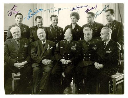 Signed photo by six of the early, pioneering Russian cosmonauts. Formal photo of ten of them is signed by Yuri Gagarin, Gherman Titov, Pavel Popovich, Andrian Nikolaev, Valeri Bykovsky and Valentina Tereshkova in various ink colors. Black and white photo measures 7'' x 5''. Fine.