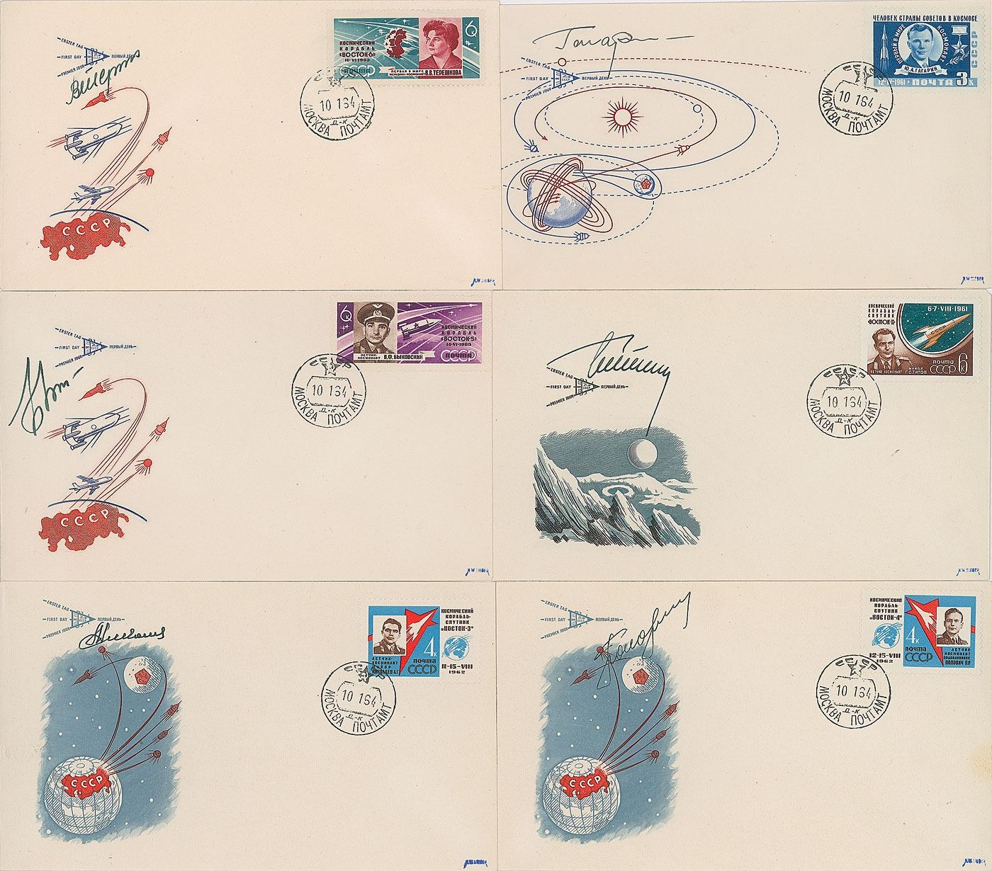 Desirable set of six KNIGA covers, all with cachets commemorating the Soviet space achievements of the Vostok program, issued and canceled to mark the first six Russian manned space missions. Each is signed in ink by one of the first six cosmonauts: Yuri Gagarin, Gherman Titov, Andriyan Nikolayev, Pavel Popovich, Valery Bykovsky, and Valentina Tereshkova. In overall fine condition.