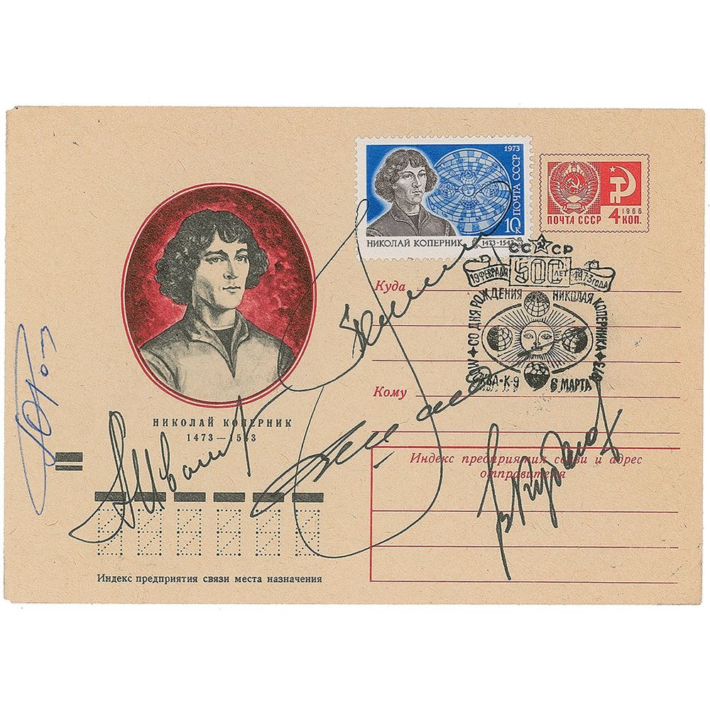Soviet commemorative cover honoring the 500th anniversary of the birth of Copernicus, signed in ink by Alexei Leonov, Valeri Kubasov, Vladimir Shatalov, Yuri Romanenko, and one other. In fine condition, with a mild crease near the bottom.