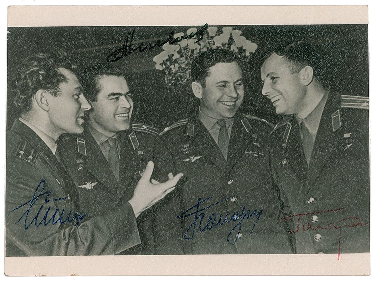 Vintage matte-finish 4.5 x 3.5 photo of Gherman Titov, Andriyan Nikolayev, Pavel Popovich, and Yuri Gagarin together in uniform, signed in ink by all four pioneers of the Vostok program. In very good to fine condition, with light creasing and moderate contrast to signatures against the dark background.