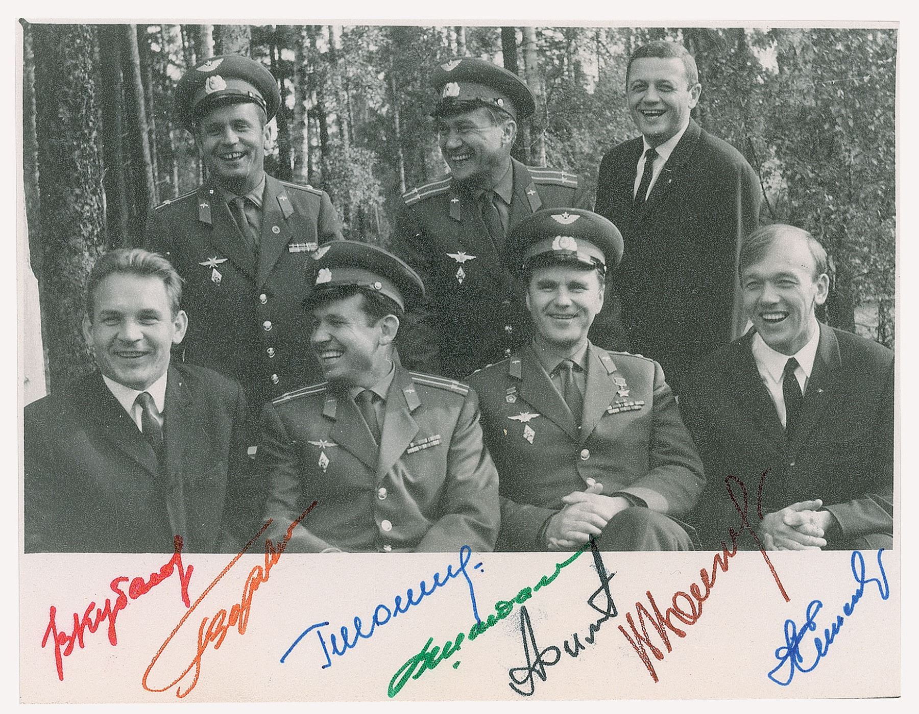 Vintage matte-finish 7.5 x 6 photo of seven early Soviet cosmonauts together, fully signed in colorful ink by Valeri Kubasov, Viktor Gorbatko, Georgy Shonin, Vladimir Shatalov, Anatoly Filipchenko, Vladislav Volkov, and Aleksei Yeliseyev. In very fine condition. Volkov's autograph is quite scarce, as he was killed during the reentry of Soyuz 11 in 1971.