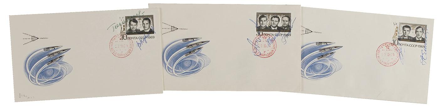 Three Soviet commemorative covers, each with a cachet honoring the space program, each signed in ballpoint by their postage stamp images by the respective cosmonauts pictured. Signers are: Valery Kubasov and Georgi Shonin (Soyuz 6); Anatoly Filipchenko, Viktor Gorbatko, and Vladislav Volkov (Soyuz 7); and Vladimir Shatalov and Alexei Yeliseyev (Soyuz 8). In fine condition.