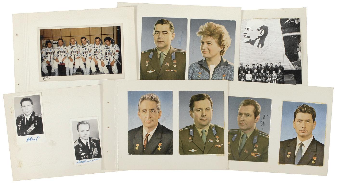 Interesting custom made photo album consisting of 48 photos, ranging in size from color 4 x 6 portraits, up to 8 x 10 color photos, with eight signed in ink or felt tip by the respective cosmonaut pictured. Photos are signed by: Andriyan Nikolayev, Valentina Tereshkova, Pyotr Klimuk, Leonid Kizim, Gherman Titov, Vladimir Lyakov, Vladimir Dzhanibekov, and Konstantin Feoktistov. Remainder of the photos are of various Soviet crews in their spacesuits, others are taken during training, meeting with dignitaries and officials, or some larger group photos. All photos are affixed to the album’s pages. In very good overall condition. A singular collection worthy of further research, with unique photos spanning the Russian space program, and containing a scarce signature of the first Belarusian in space, Pytor Klimuk.