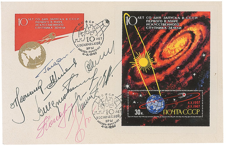 Commemorative cover, 8.75 x 5.75, with a cachet honoring Soviet space program, signed in ink by the first 10 Soviet cosmonauts. Signers are: Yuri Gagarin, Gherman Titov, Andriyan Nikolayev, Pavel Popovich, Valeriy Bykovsky, Valentina Tereshkova, Vladimir Komarov, Pavel Belyayev, Georgiy Beregovoy, and Vladimir Shatalov. In fine condition, with a couple tiny creases and a light shade of uniform toning.