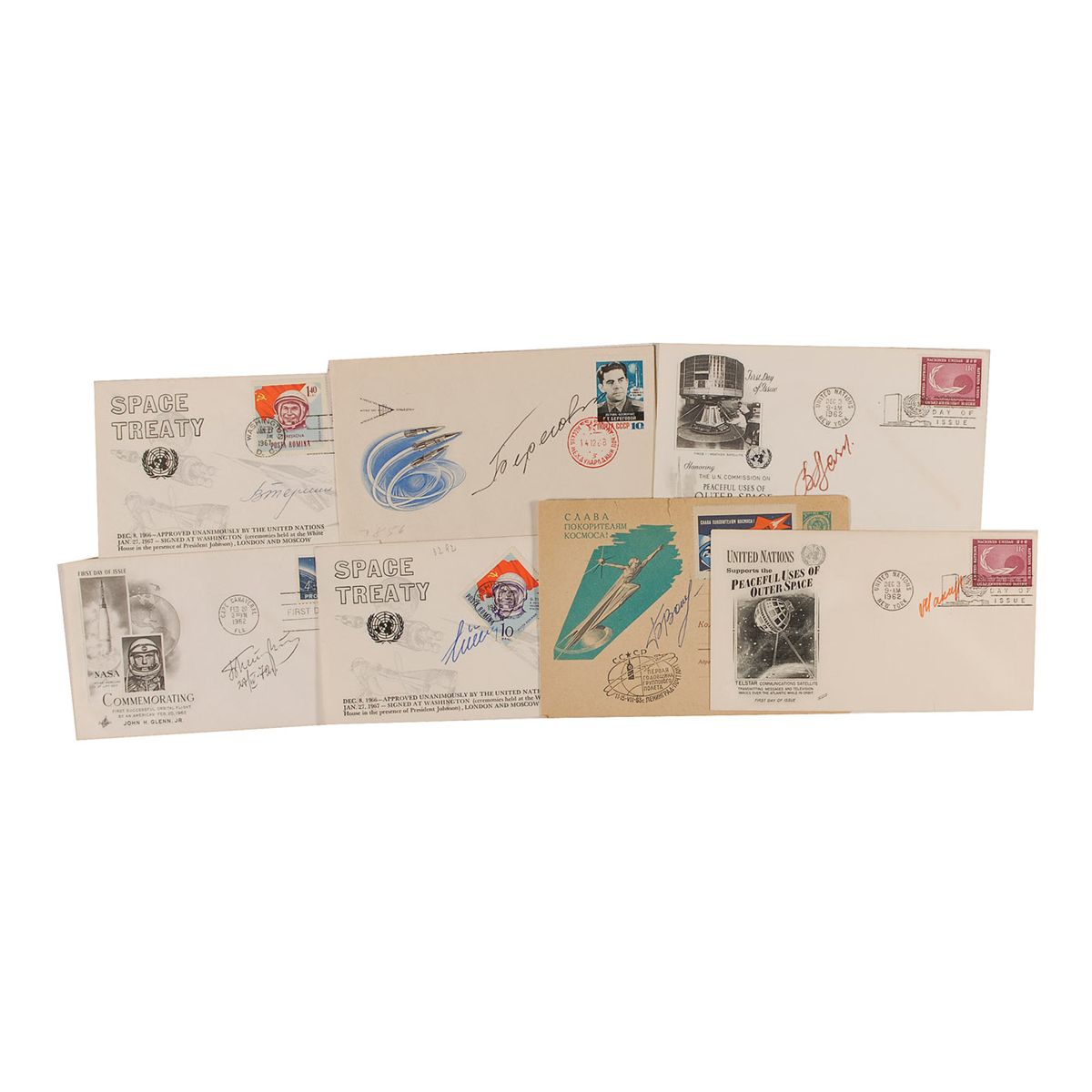 Seven covers: three FDCs, two commemorating Peaceful Uses of Outer Space and one the First Successful Orbital Flight by an American, John H. Glenn, each individually signed in felt tip or ballpoint by a cosmonaut. Signers are: Vasily Lazarev, Boris Petrov, and Oleg Makarov; and four commemorative covers, each individually signed in felt tip or ballpoint by a cosmonaut. Signers are: Georgy Beregovoy, Valentina Tereshkova, Gherman Titov, and Boris Volynov. In fine condition, with a few tears to the top edge of Volynov’s cover, and a few numeric pencil notations in another hand.