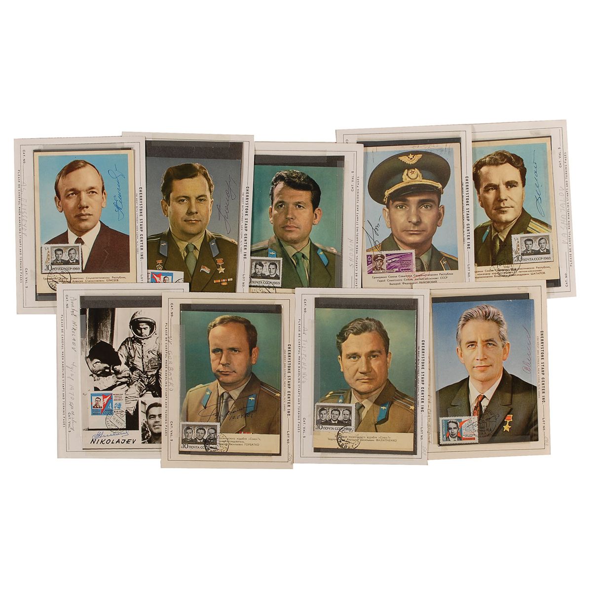Nine postcard photos, eight color, 4.25 x 5.75, each postmarked, stamped, and affixed to Cherrystone Stamp Center mounts, featuring acclaimed cosmonauts, each signed in ballpoint by the respective cosmonaut pictured. Signers are: Vladimir Shatalov, Valery Bykovsky, Georgy Shonin, Pavel Popovich, Aleksei Yeliseyev, Konstantin Feoktistov, Anatoly Filipchenko, Viktor Gorbatko, and Andriyan Nikolayev. In fine condition, with Filipchenko’s signature faded and barely legible.