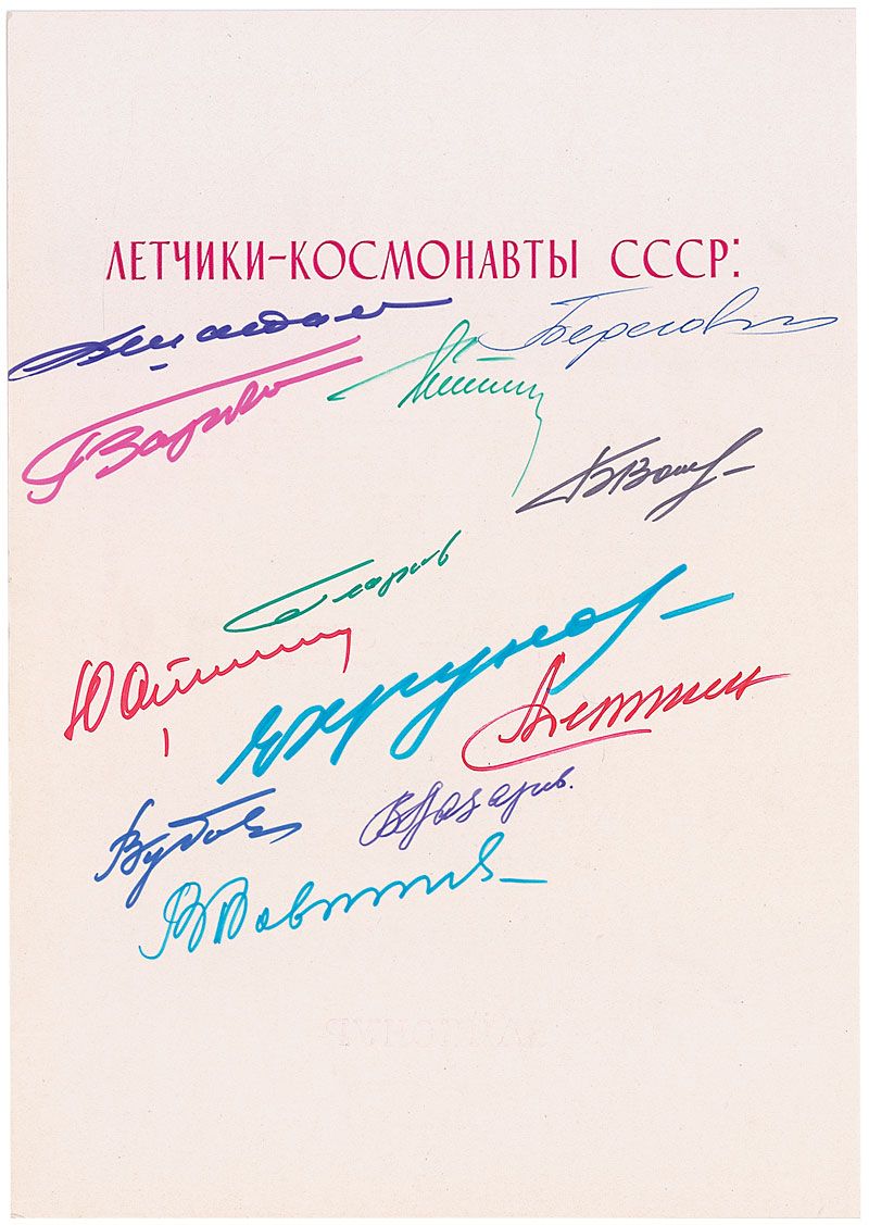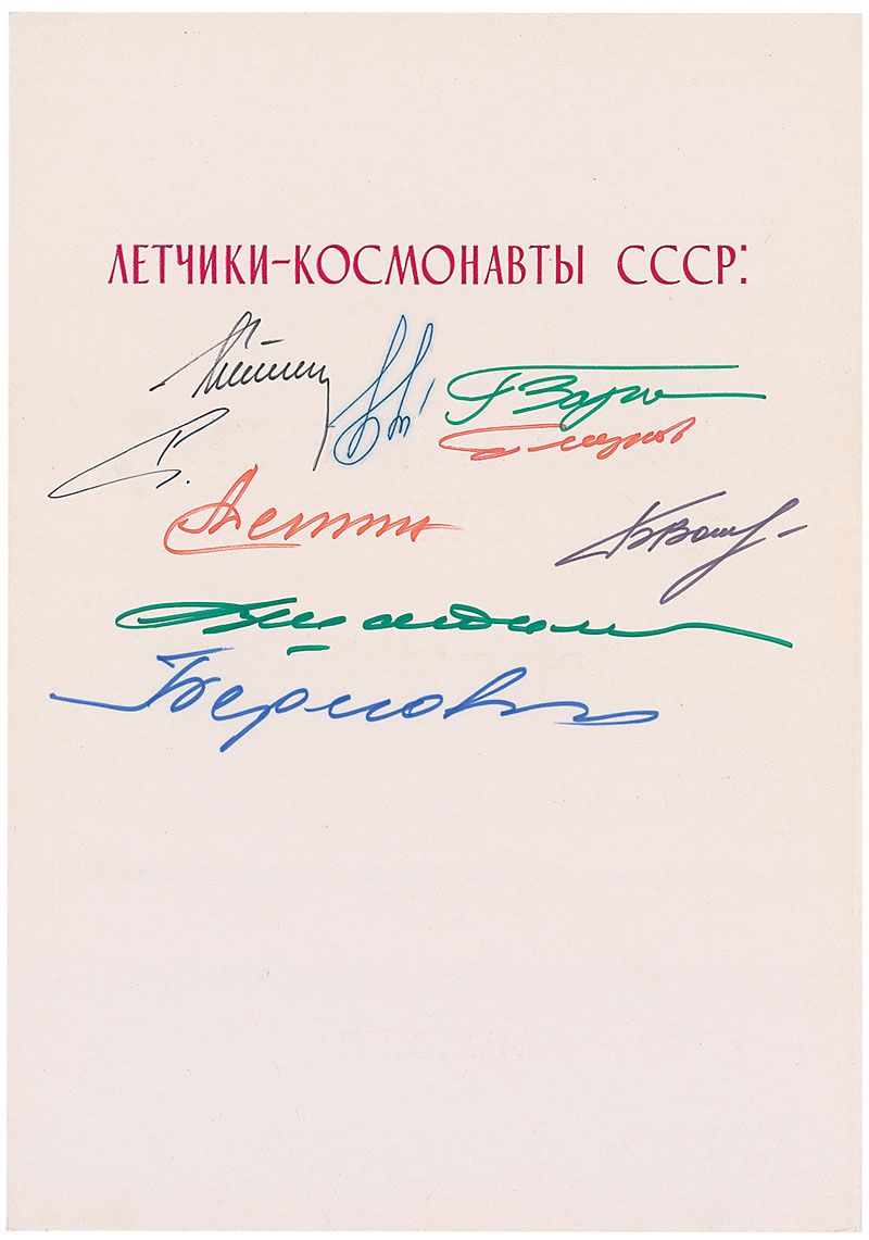 Two unissued awards citations, each 8 x 11.25, two pages. These citations were prepared to be awarded in commemoration of the 20th anniversary of the space era. One is signed inside in felt tip by Gherman Titov, Vladimir Shatalov, Georgi Beregovoy, Viktor Gorbatko, Yuri Glazkov, Boris Volynov, Yuri Artyukhin, Yevgeny Khrunov, Lev Demin, Vyacheslav Zudov, Vasili Lazarev, and Vladimir Kovalyonok; the second is signed by Gherman Titov, Valeri Bykovski, Viktor Gorbatko, Yuri Glazkov, Valeri Rozhdestvenski, Lev Demin, Boris Volynov, Vladimir Shatalov, and Georgi Beregovoy. In fine condition.