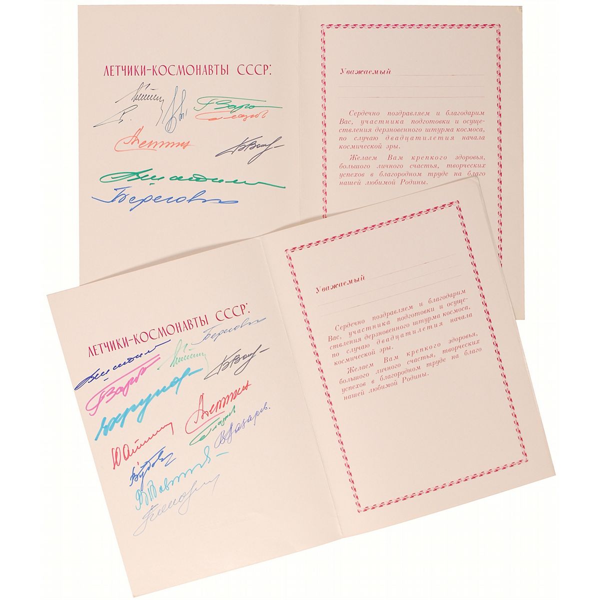 Two unissued awards citations, each 8 x 11.25, two pages. These citations were prepared to be awarded in commemoration of the 20th anniversary of the space era. One is signed inside in felt tip by nine cosmonauts: Valeri Bykovski, Valeri Rozhdestvenski, Yuri Glazkov, Lev Dyomin, and Georgi Beregovoy; the second is signed inside in felt tip by 13 cosmonauts: Gherman Titov, Georgi Beregovoy, Vladimir Shatalov, Viktor Gorbatko, Yevgeny Khrunov, Boris Volynov, Yuri Artyukhin, Lev Dyomin, Vyacheslav Zudov, Yuri Glazkov, Vladimir Kovalyonok, Vasyli Lazarev, and Pavel Popovich. In fine condition.