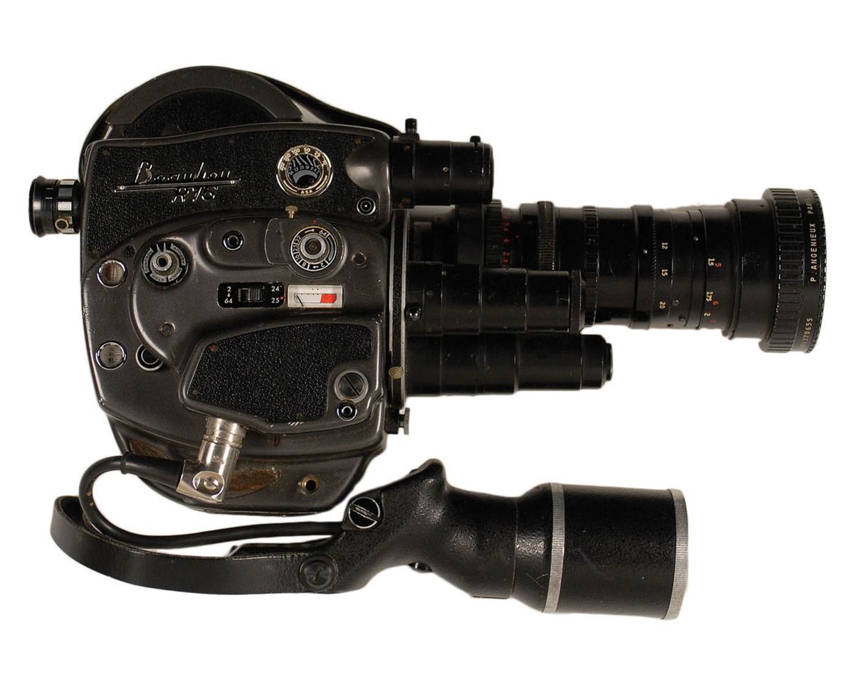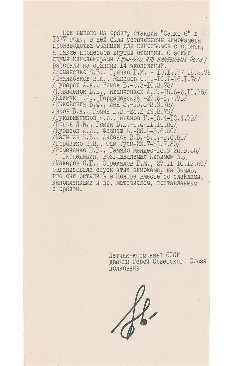 Extensively flown Beaulieu movie camera flown to the Salyut 6 space station on board Soyuz 26 in 1977 and returned to earth three years later on board Soyuz T-3. This 16 mm camera is fitted with a semi-automatic P. Angenieux (Paris) 120 mm zoom lens that is designed for outdoor use only. During the period this was on board the space station it was available for use (during EVAs only) by a total of 29 cosmonauts who served aboard Salyut 6, including Yuri Romanenko, Georgi Grechko, Vladimir Dzhanibekov, Oleg Makarov, Aleksei Gubarev, Valery Bykovsky, Leonid Kizim, and Gennady Strekalov. Camera is accompanied by a counterbalance and battery which screws into the bottom. Also accompanied by a typed letter of authenticity from Valery Bykovsky, listing the 29 cosmonauts who had access to the camera while it was in space. In fine and apparent working condition. A total of three space walks were conducted on Salyut 6 from 1977–1979, although it is unknown if this camera was used during any of the EVAs. Provenance: Ex-Valery Bykovsky; Superior Auction.