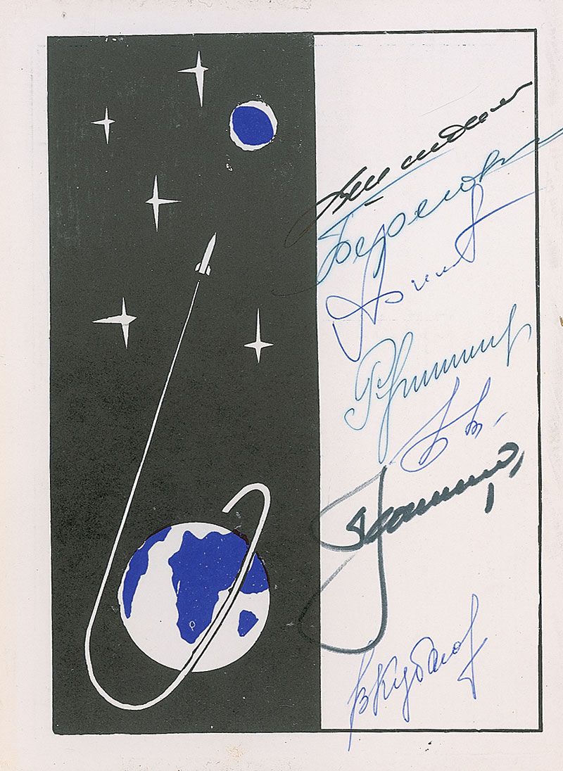 Color Russian seminar card, 6 x 8, signed in ink and felt tip by seven cosmonauts. Signers are: Vladimir Shatalov, Georgy Beregovoy, Anatoly Filipchenko, Nikolay Rukavishnikov, Valery Bykovsky, Alexei Leonov, and Valeri Kubasov. In fine condition.