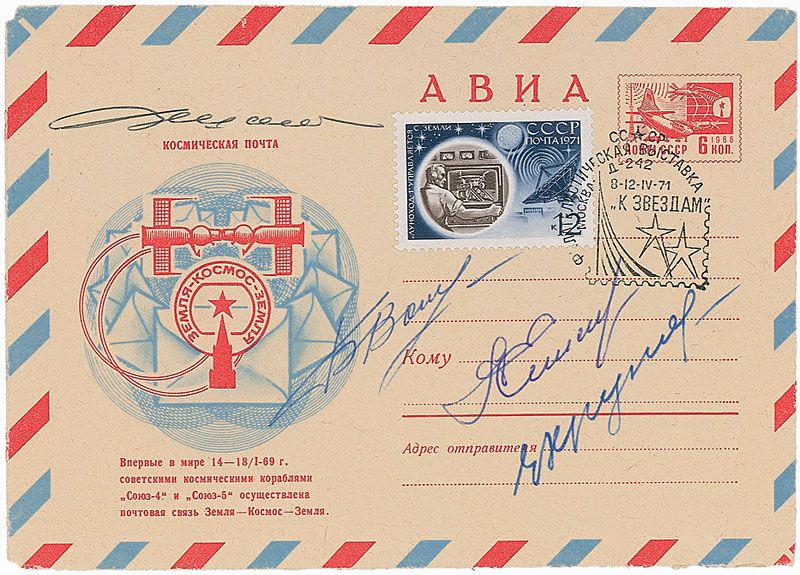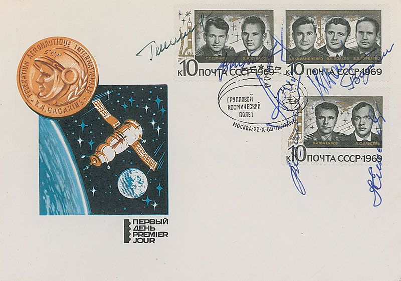 Two commemorative covers. Both 6 x 4.5, one with a cachet honoring Yuri Gagarin, with postage stamps honoring the Soyuz 6, 7, and 8 missions, signed in blue and black ballpoint by all seven members; and one with a cachet honoring the Russian space program, signed in blue and black ink by the crew members of Soyuz 5 and Vladimir Shatalov. In fine condition.
