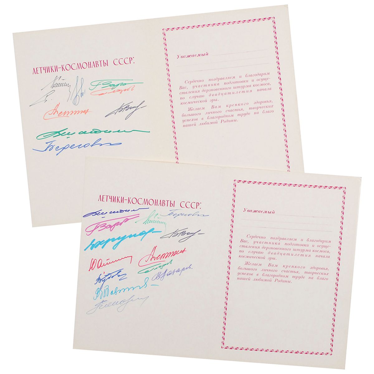 Two unissued awards citations, in Russian, each 8 x 11.25, two pages. These citations were prepared to be awarded in commemoration of the 20th anniversary of the space era. One is signed inside in felt tip by nine cosmonauts including Valeri Bykovski, Valeri Rozhdestvenski, Yuri Glazkov, Lev Dyomin, and Georgi Beregovoy; the second is signed inside in felt tip by 13 cosmonauts: Gherman Titov, Georgi Beregovoy, Vladimir Shatalov, Viktor Gorbatko, Yevgeny Khrunov, Boris Volynov, Yuri Artyukhin, Lev Dyomin, Vyacheslav Zudov, Yuri Glazkov, Vladimir Kovalyonok, Vasyli Lazarev, and Pavel Popovich. In fine condition.