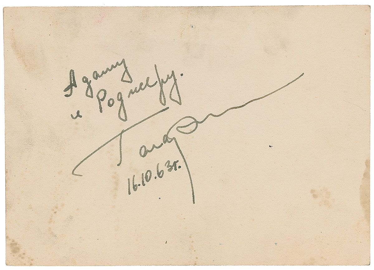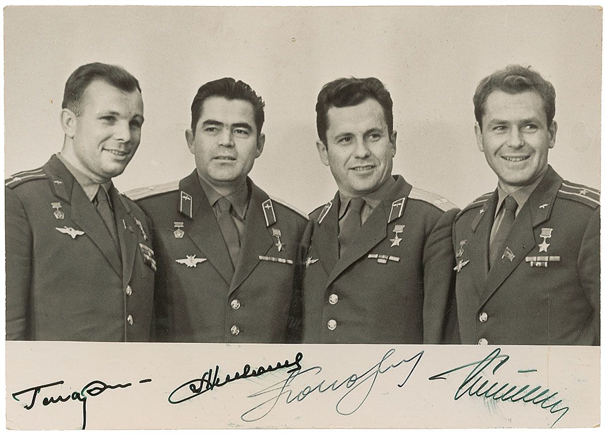 Vintage glossy 6 x 4.25 photo of the first four cosmonauts, signed in the lower border in black ink, “Gagarin,” “Nikolayev,” “Popovich,” and “Titov.” Reverse is also signed and inscribed in black ink by Gagarin, and dated October 16, 1963. In very good condition, with a vertical crease to right side, a tack hole to top, some scattered light surface marks, soiling to reverse, and slight brushing to a couple of signatures.