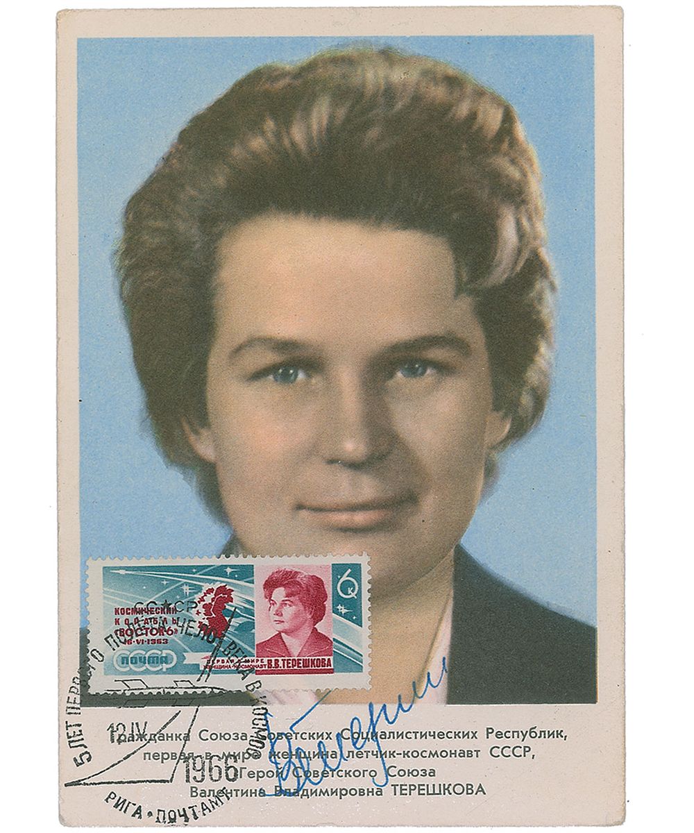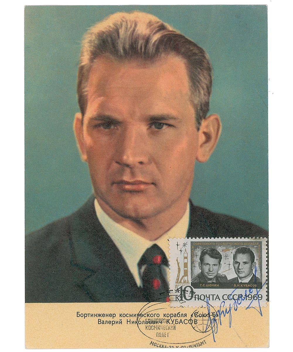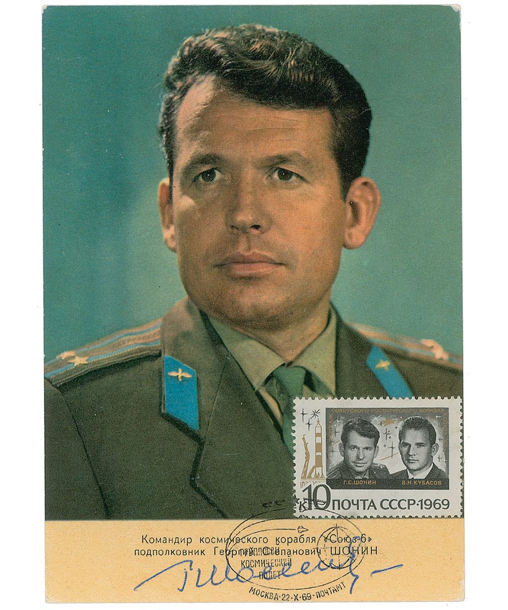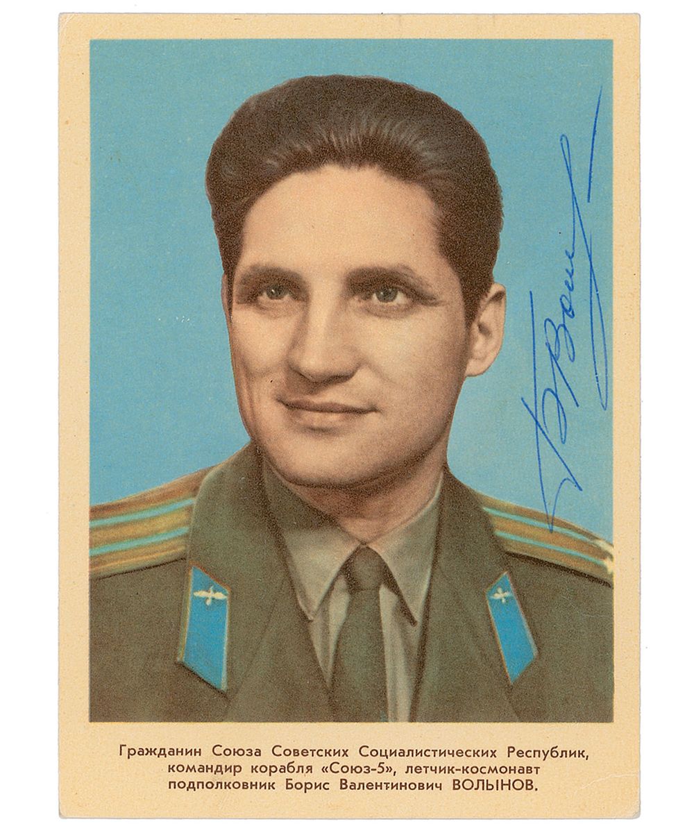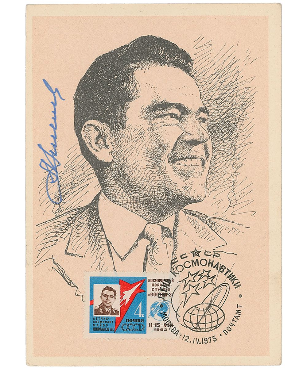 Amazing collection of 25 Kniga covers and 19 postcards, each signed by a cosmonaut. Kniga covers include: Yuri Gagarin; Gherman Titov; Valery Bykovsky; Andriyan Nikolayev; Pavel Popovich; Valentina Tereshkova; Pavel Belyayev and Alexey Leonov; Vladimir Komarov, Konstantin Feoktistov, and Boris Yegorov; Georgy Beregovoy; Vladimir Shatalov and Aleksei Yeliseyev; Vladimir Shatalov, Boris Volynov, Aleksei Yeliseyev, and Yevgeny Khrunov; Georgy Shonin and Valeri Kubasov; Anatoly Filipchenko, Vladislav Volkov, and Viktor Gorbatko; Vasili Lazarev and Oleg Makarov; Pyotr Klimuk and Valentin Lebedev; Pavel Popovich and Yuri Artyukhin; Gennadi Sarafanov and Lev Dyomin; Aleksei Gubarev and Georgi Grechko; Pyotr Klimuk and Vitaly Sevastyanov; Anatoly Filipchenko and Nikolay Rukavishnikov; Viktor Gorbatko and Yuri Glazkov; Andriyan Nikolayev and Vitaly Sevastyanov; Boris Volynov and Vitaly Zholobov; Vyacheslav Zudov and Valery Rozhdestvensky; and Alexey Leonov and Valeri Kubasov. Signed postcards include: Aleksei Yeliseyev; Valeri Kubasov; Viktor Gorbatko; Vladislav Volkov; Nikolay Rukavishnikov; Georgy Beregovoy; Vladimir Shatalov; Aleksei Yeliseyev; Boris Volynov; Yevgeny Khrunov; Alexey Leonov; Vladimir Shatalov; Georgy Shonin; Andriyan Nikolayev; Vitaly Sevastyanov; Valery Bykovsky; Konstantin Feoktistov; Valentina Tereshkova; and Boris Yegorov. In overall fine to very fine condition. An incredible instant collection of rarely seen items.