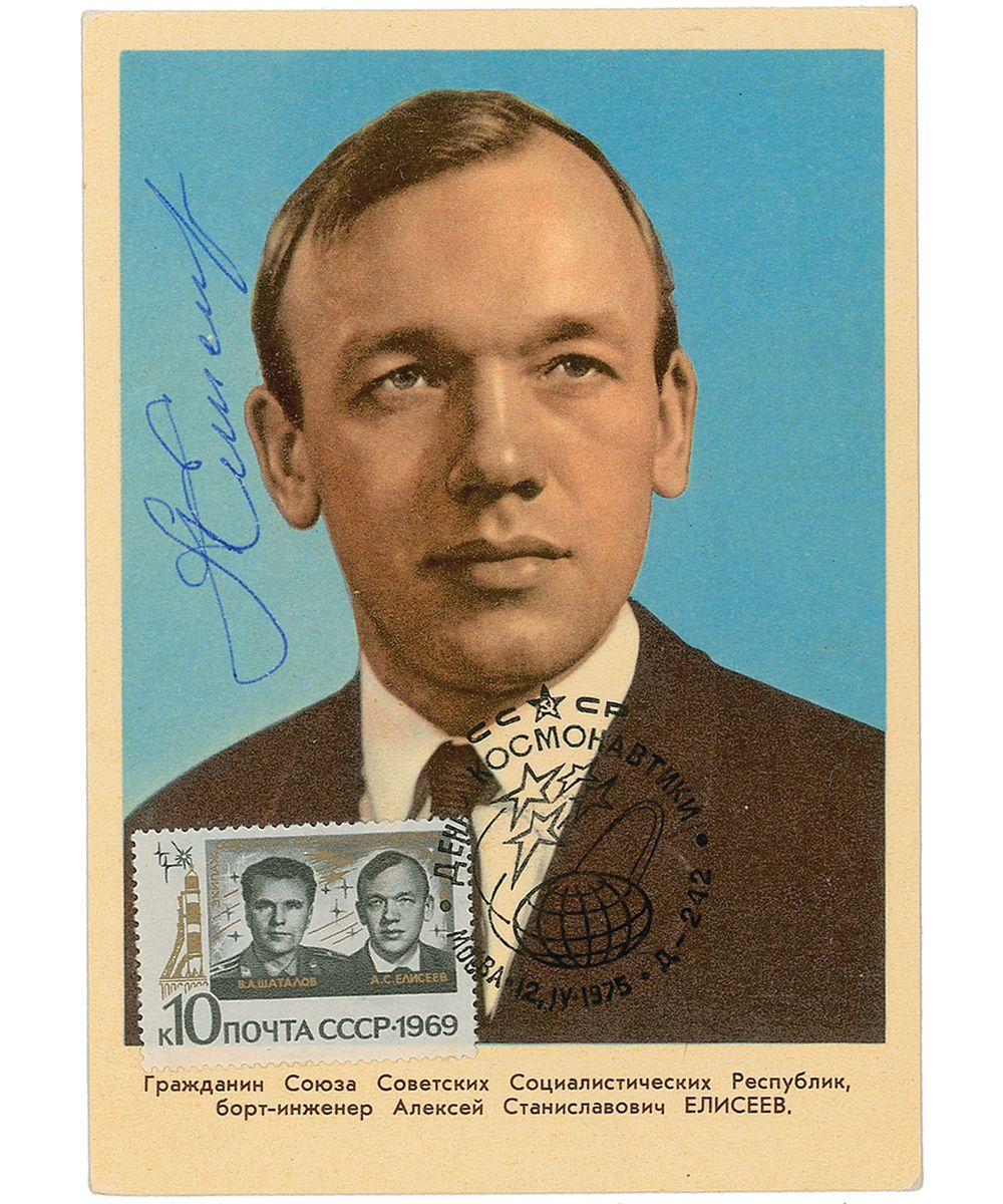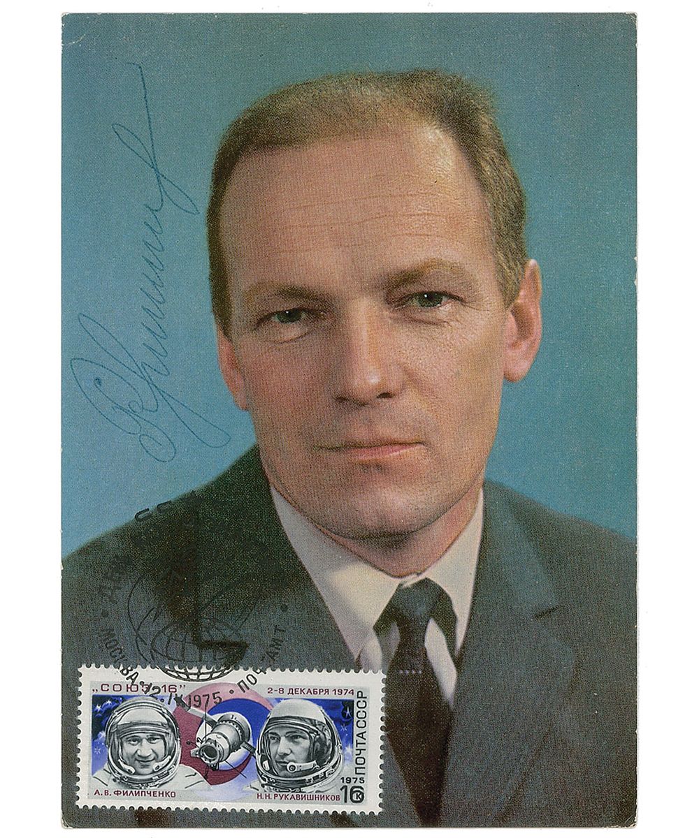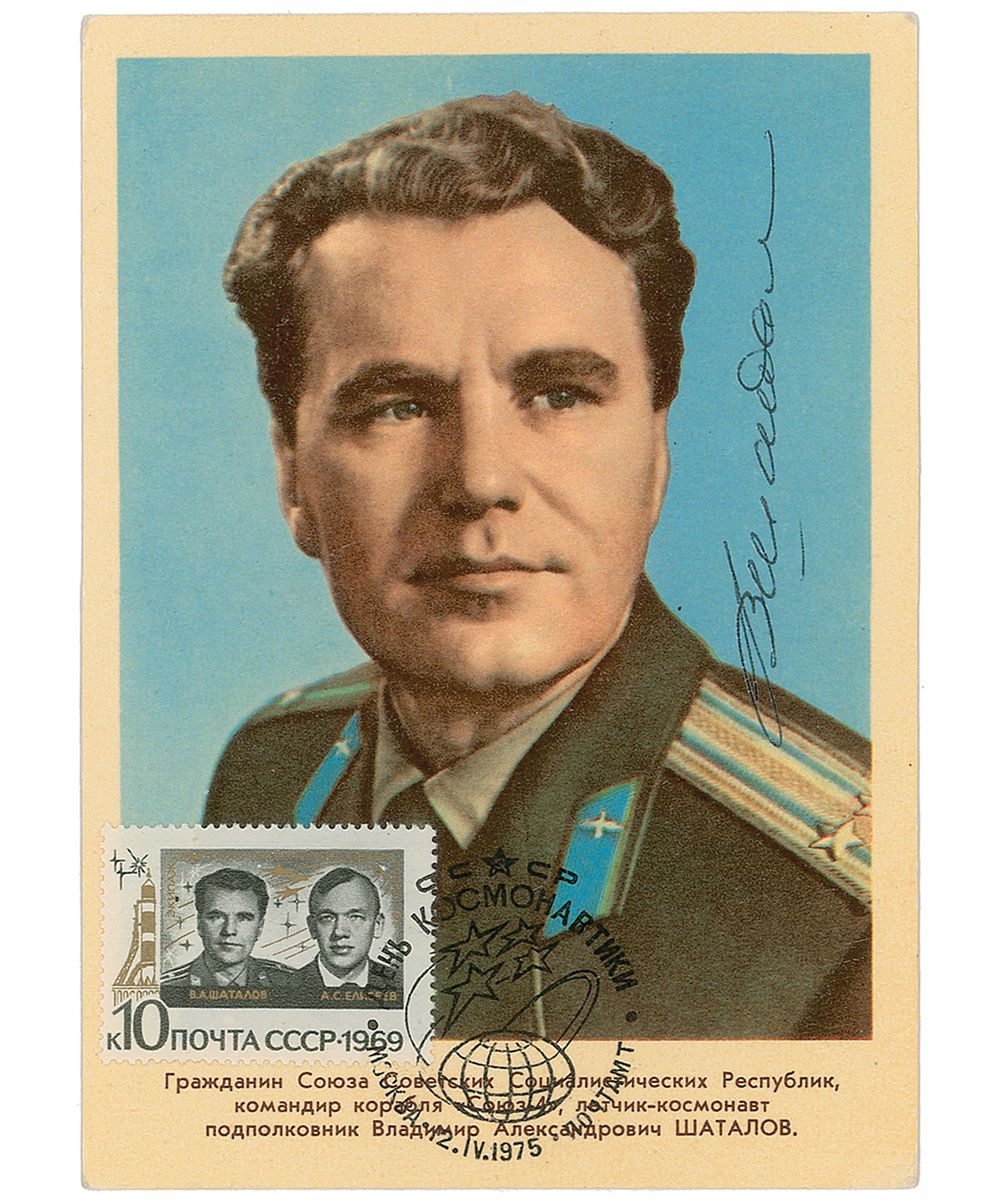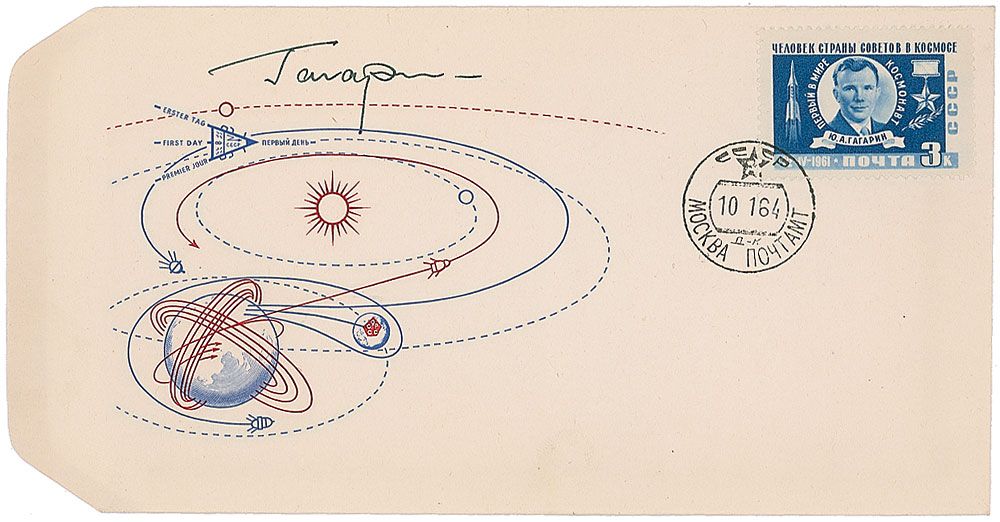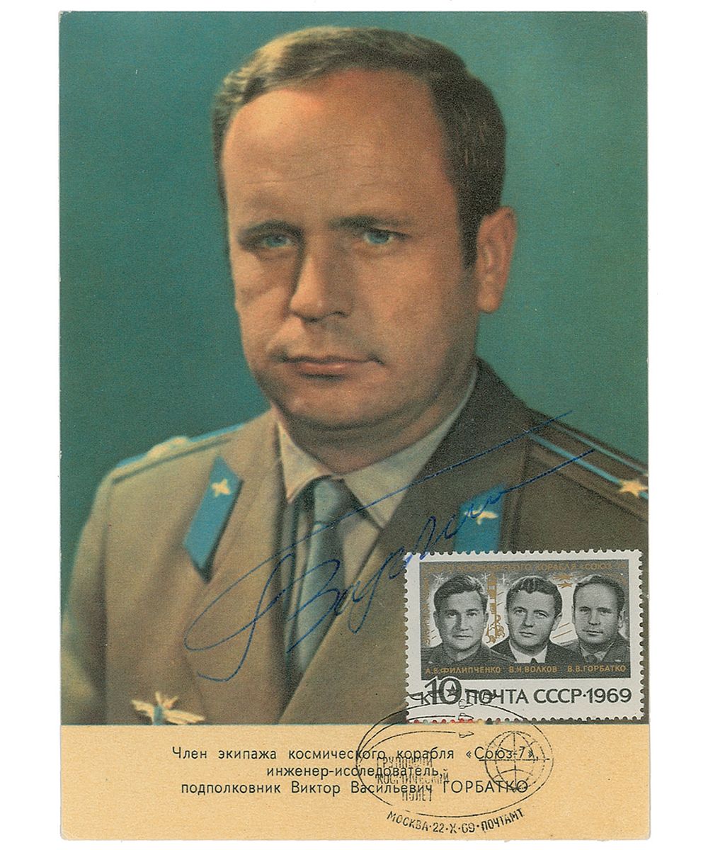 Amazing collection of 25 Kniga covers and 19 postcards, each signed by a cosmonaut. Kniga covers include: Yuri Gagarin; Gherman Titov; Valery Bykovsky; Andriyan Nikolayev; Pavel Popovich; Valentina Tereshkova; Pavel Belyayev and Alexey Leonov; Vladimir Komarov, Konstantin Feoktistov, and Boris Yegorov; Georgy Beregovoy; Vladimir Shatalov and Aleksei Yeliseyev; Vladimir Shatalov, Boris Volynov, Aleksei Yeliseyev, and Yevgeny Khrunov; Georgy Shonin and Valeri Kubasov; Anatoly Filipchenko, Vladislav Volkov, and Viktor Gorbatko; Vasili Lazarev and Oleg Makarov; Pyotr Klimuk and Valentin Lebedev; Pavel Popovich and Yuri Artyukhin; Gennadi Sarafanov and Lev Dyomin; Aleksei Gubarev and Georgi Grechko; Pyotr Klimuk and Vitaly Sevastyanov; Anatoly Filipchenko and Nikolay Rukavishnikov; Viktor Gorbatko and Yuri Glazkov; Andriyan Nikolayev and Vitaly Sevastyanov; Boris Volynov and Vitaly Zholobov; Vyacheslav Zudov and Valery Rozhdestvensky; and Alexey Leonov and Valeri Kubasov. Signed postcards include: Aleksei Yeliseyev; Valeri Kubasov; Viktor Gorbatko; Vladislav Volkov; Nikolay Rukavishnikov; Georgy Beregovoy; Vladimir Shatalov; Aleksei Yeliseyev; Boris Volynov; Yevgeny Khrunov; Alexey Leonov; Vladimir Shatalov; Georgy Shonin; Andriyan Nikolayev; Vitaly Sevastyanov; Valery Bykovsky; Konstantin Feoktistov; Valentina Tereshkova; and Boris Yegorov. In overall fine to very fine condition. An incredible instant collection of rarely seen items.