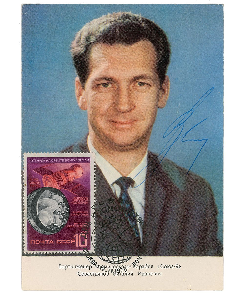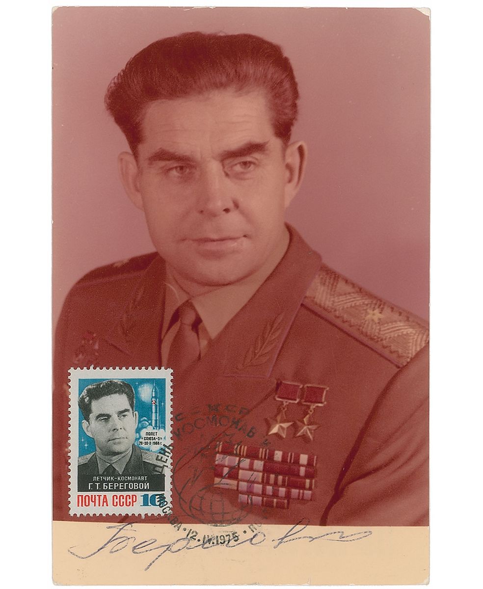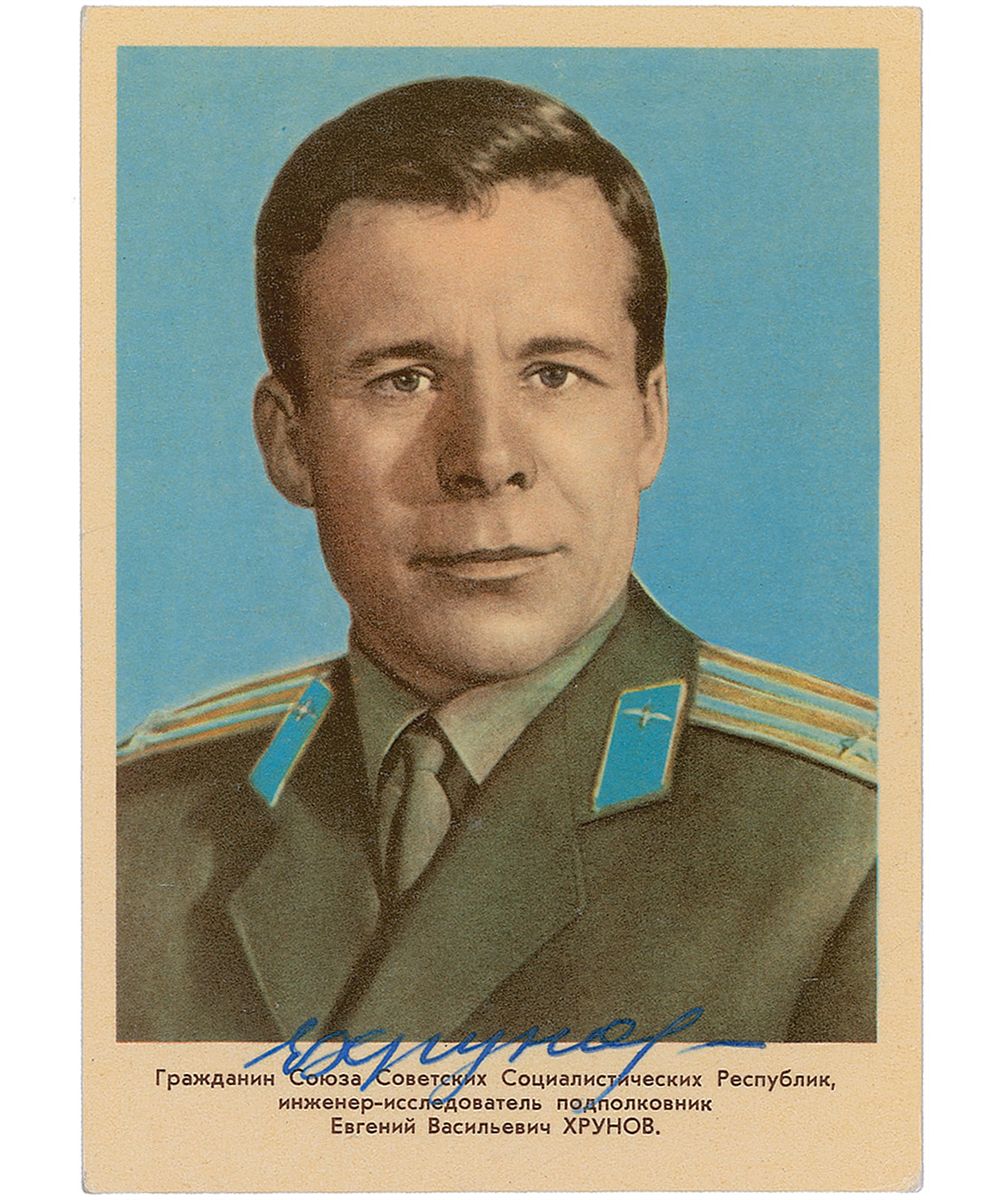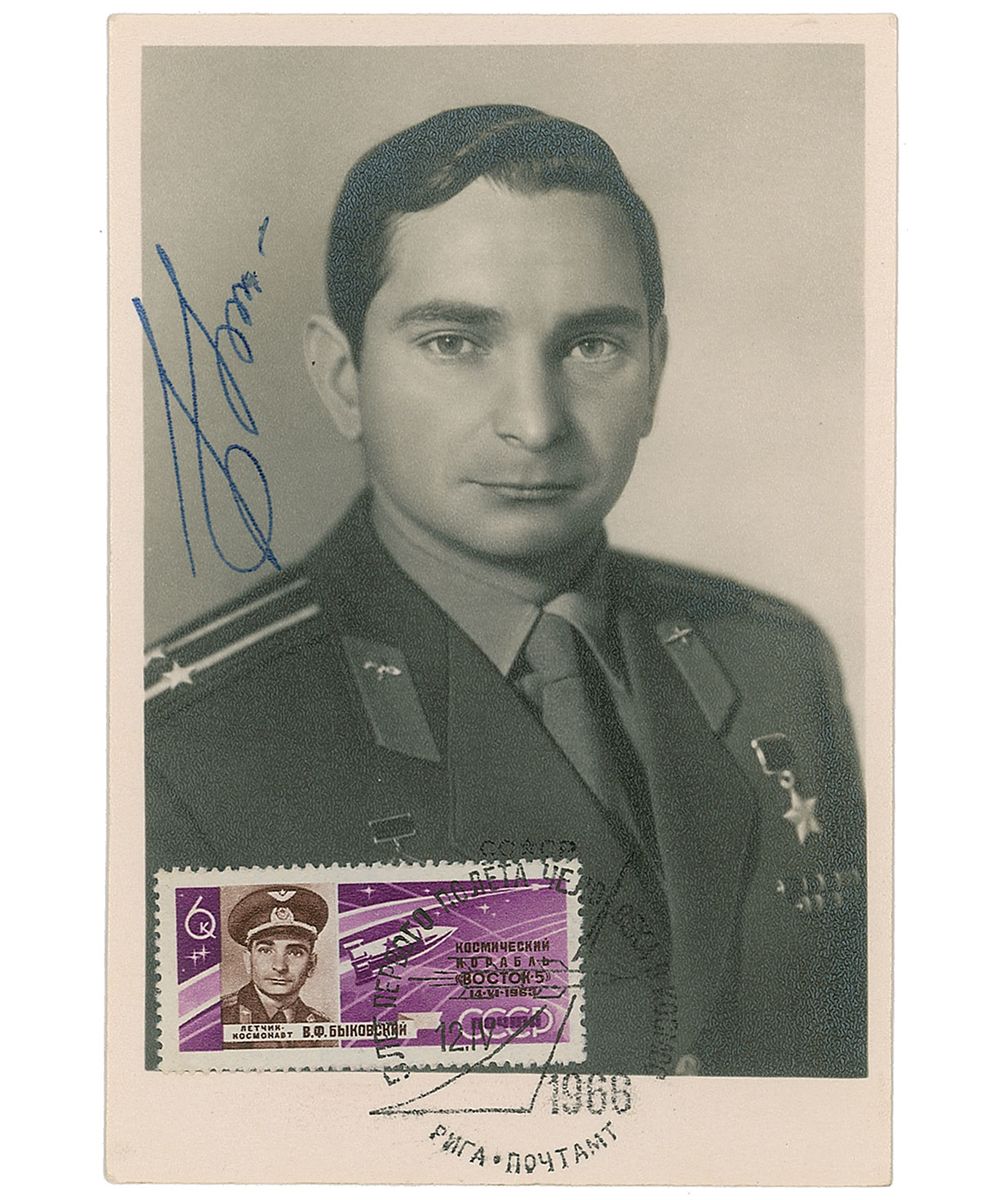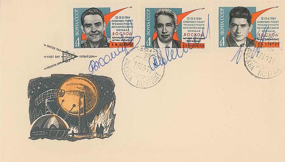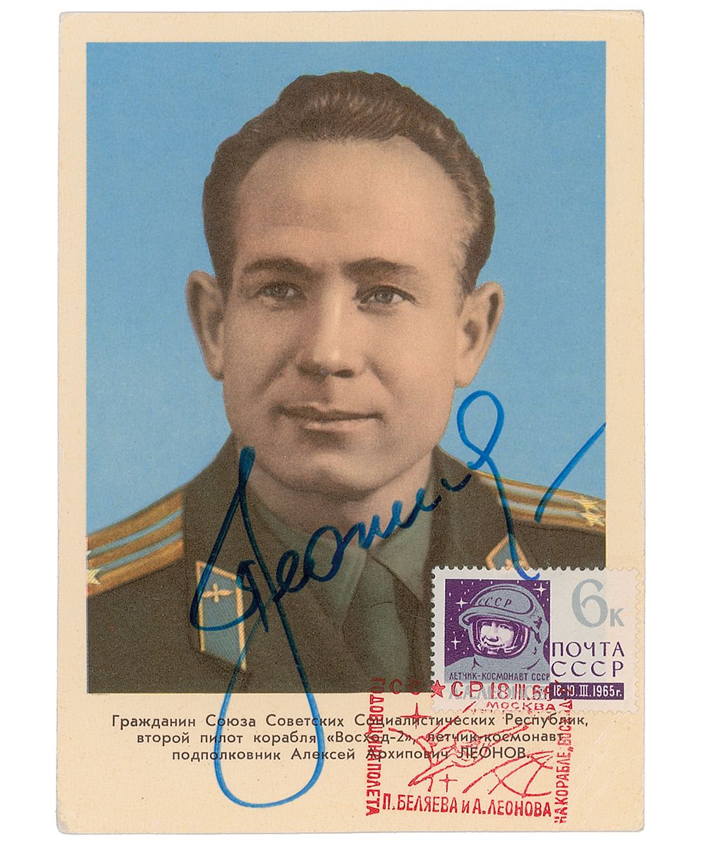 Amazing collection of 25 Kniga covers and 19 postcards, each signed by a cosmonaut. Kniga covers include: Yuri Gagarin; Gherman Titov; Valery Bykovsky; Andriyan Nikolayev; Pavel Popovich; Valentina Tereshkova; Pavel Belyayev and Alexey Leonov; Vladimir Komarov, Konstantin Feoktistov, and Boris Yegorov; Georgy Beregovoy; Vladimir Shatalov and Aleksei Yeliseyev; Vladimir Shatalov, Boris Volynov, Aleksei Yeliseyev, and Yevgeny Khrunov; Georgy Shonin and Valeri Kubasov; Anatoly Filipchenko, Vladislav Volkov, and Viktor Gorbatko; Vasili Lazarev and Oleg Makarov; Pyotr Klimuk and Valentin Lebedev; Pavel Popovich and Yuri Artyukhin; Gennadi Sarafanov and Lev Dyomin; Aleksei Gubarev and Georgi Grechko; Pyotr Klimuk and Vitaly Sevastyanov; Anatoly Filipchenko and Nikolay Rukavishnikov; Viktor Gorbatko and Yuri Glazkov; Andriyan Nikolayev and Vitaly Sevastyanov; Boris Volynov and Vitaly Zholobov; Vyacheslav Zudov and Valery Rozhdestvensky; and Alexey Leonov and Valeri Kubasov. Signed postcards include: Aleksei Yeliseyev; Valeri Kubasov; Viktor Gorbatko; Vladislav Volkov; Nikolay Rukavishnikov; Georgy Beregovoy; Vladimir Shatalov; Aleksei Yeliseyev; Boris Volynov; Yevgeny Khrunov; Alexey Leonov; Vladimir Shatalov; Georgy Shonin; Andriyan Nikolayev; Vitaly Sevastyanov; Valery Bykovsky; Konstantin Feoktistov; Valentina Tereshkova; and Boris Yegorov. In overall fine to very fine condition. An incredible instant collection of rarely seen items.