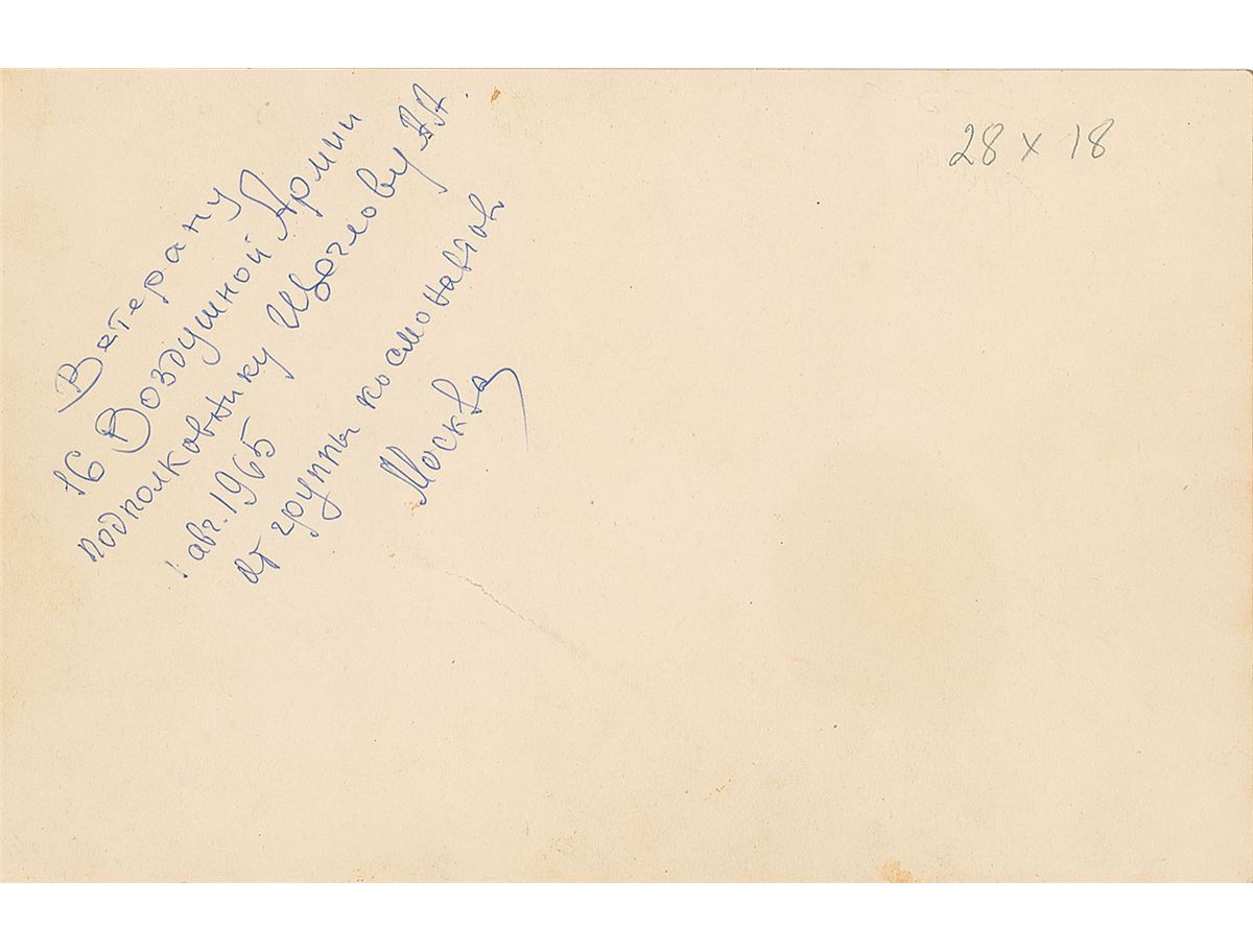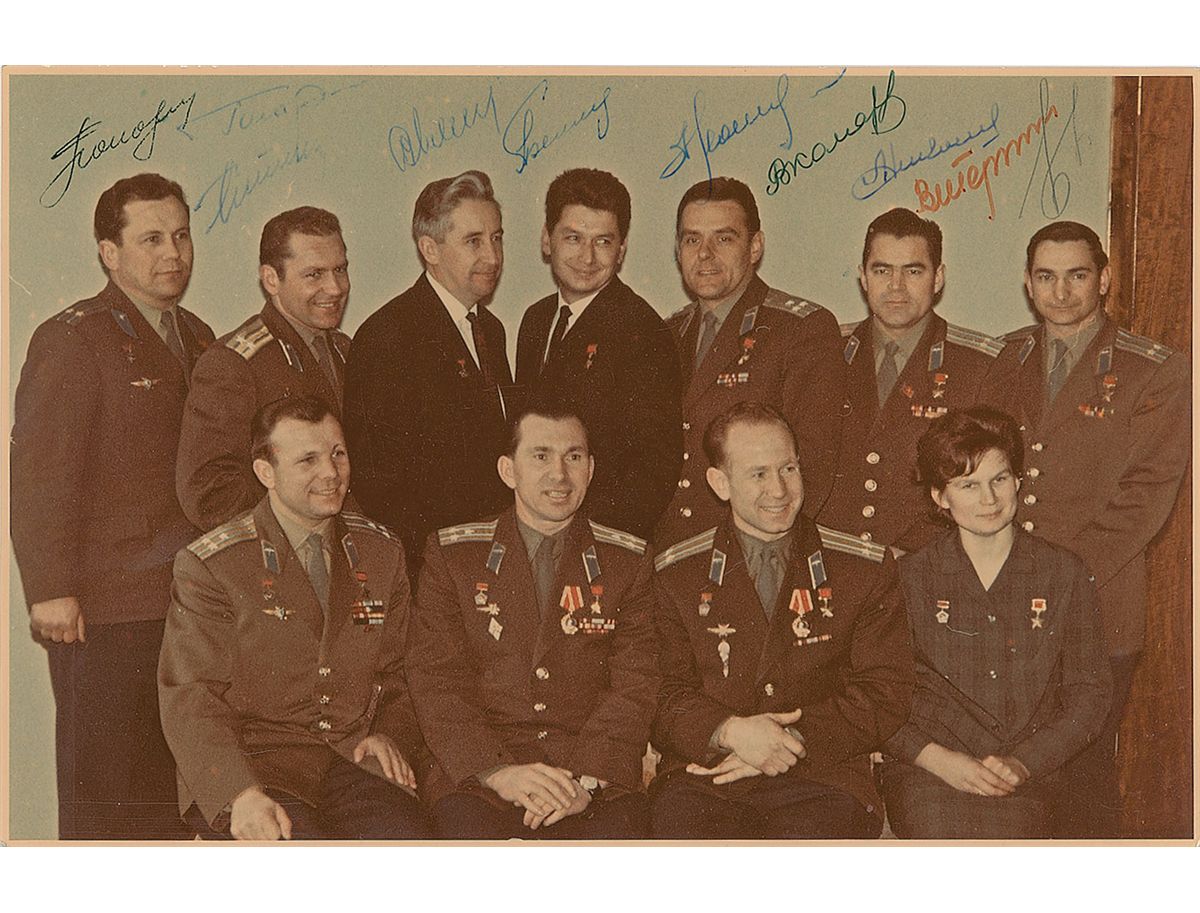 Color vintage glossy 10.75 x 7 photo of the Soviet Union’s first cosmonauts posing together, signed in felt tip and ink by all ten: Yuri Gagarin, Gherman Titov, Andrian Nikolaev, Pavel Popovich, Valery Bykovsky, Pavel Belyaev, Valentina Tereshkova, Vladimir Komarov, Boris Yegorov, and Konstantin Feoktistov. Reverse of the photo is inscribed in an unknown hand to 16th Airborne Army Colonel Scheglov, and dated August 1, 1965. In fine condition, with a bit of light irregular ink adhesion to a couple of signatures. A remarkable assemblage of cosmonauts on an uncommon portrait.
