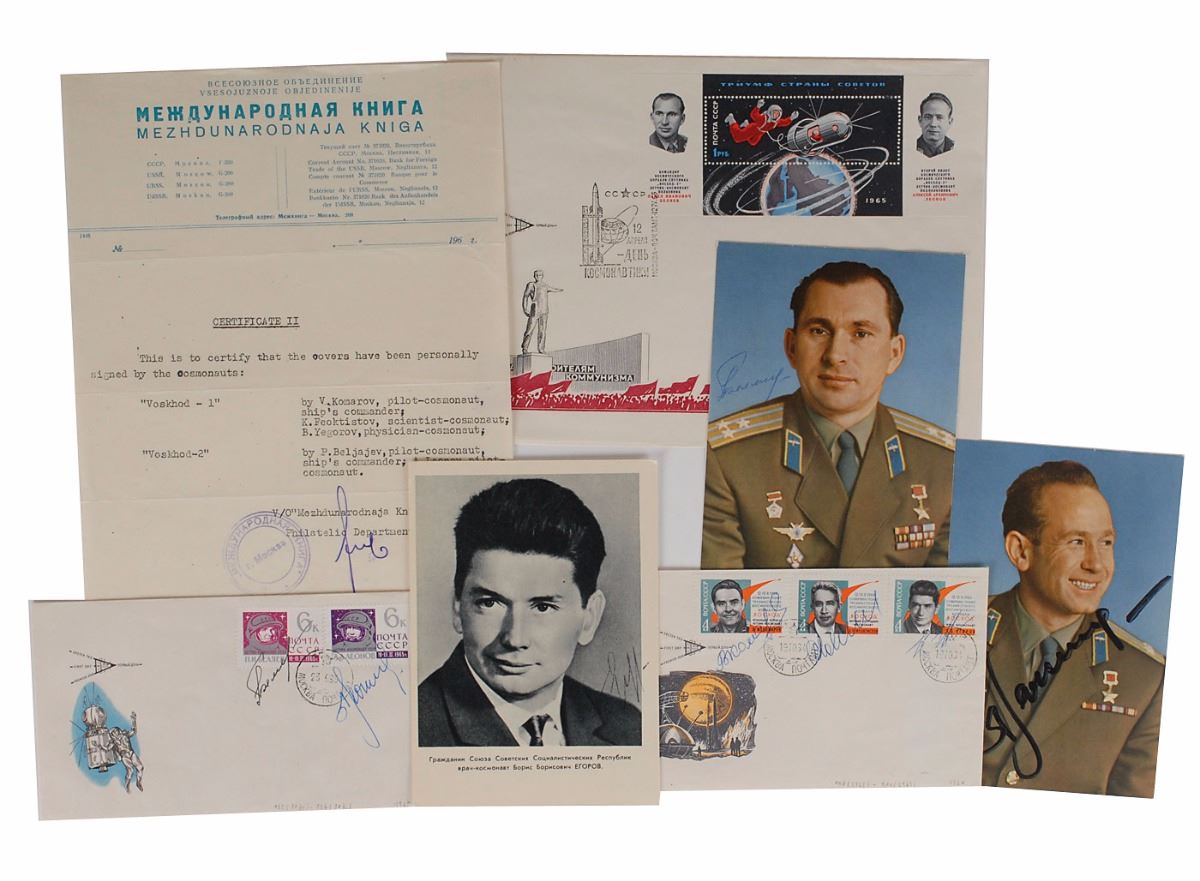 Collection of five items signed by cosmonauts, including: three postcard photos of Yegorov, Leonov, and Belyayev, individually signed in black ink; a Vokshod 1 Kniga cover, signed in blue ballpoint by Yegorov, Komarov, and Feoktistov; and a Vokshod 2 Kniga cover signed in ink by Leonov and Belyayev. In overall fine condition, with some irregular ink adhesion to the signature on the Yegorov photo. Accompanied by a letter of authenticity from the Russian philatelic department for the two Kniga covers.