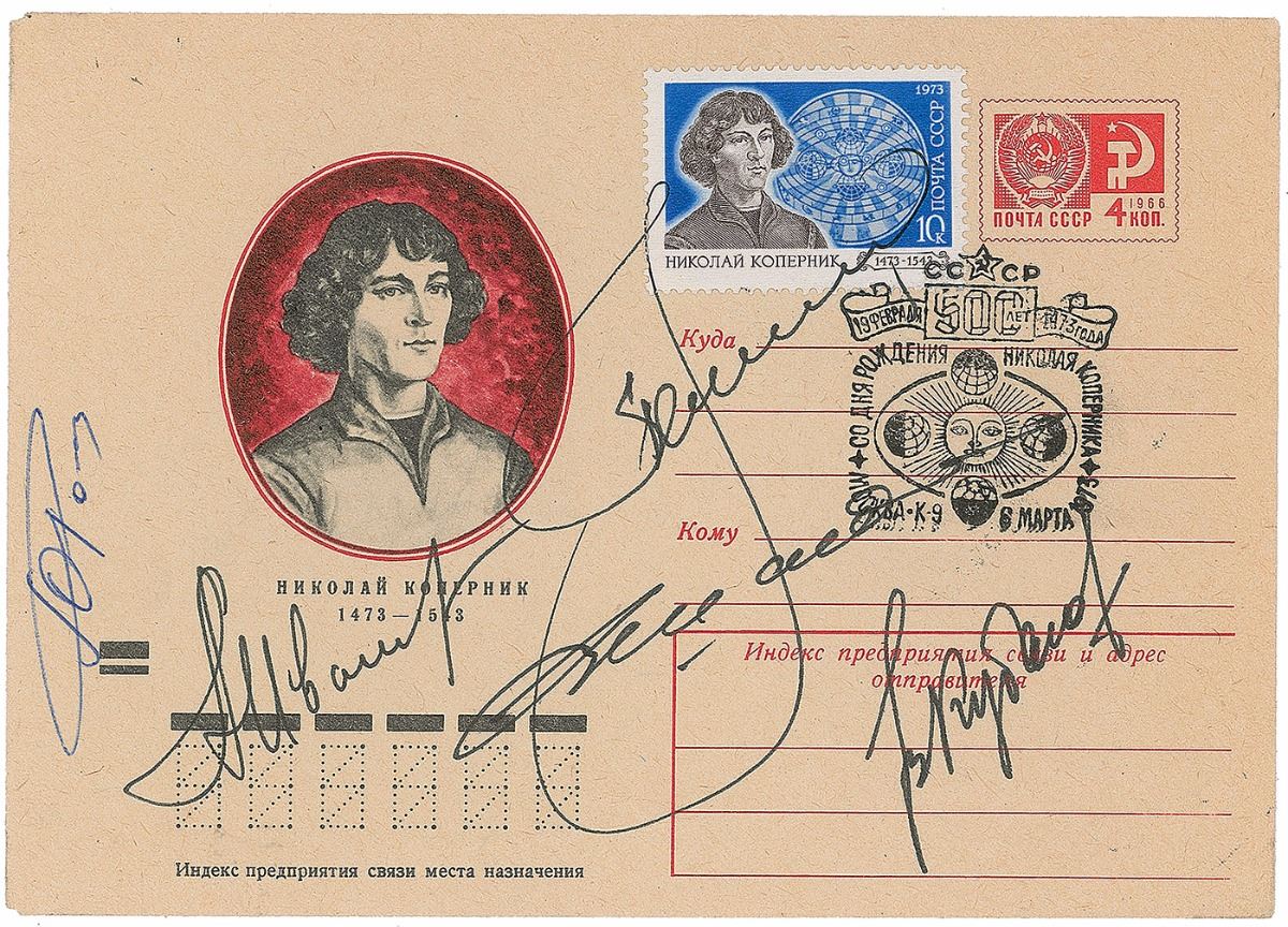 Soviet commemorative cover honoring the 500th anniversary of the birth of Copernicus, signed in ink by Alexei Leonov, Valeri Kubasov, Vladimir Shatalov, Yuri Romanenko, and one other. In fine condition, with a mild crease near the bottom.