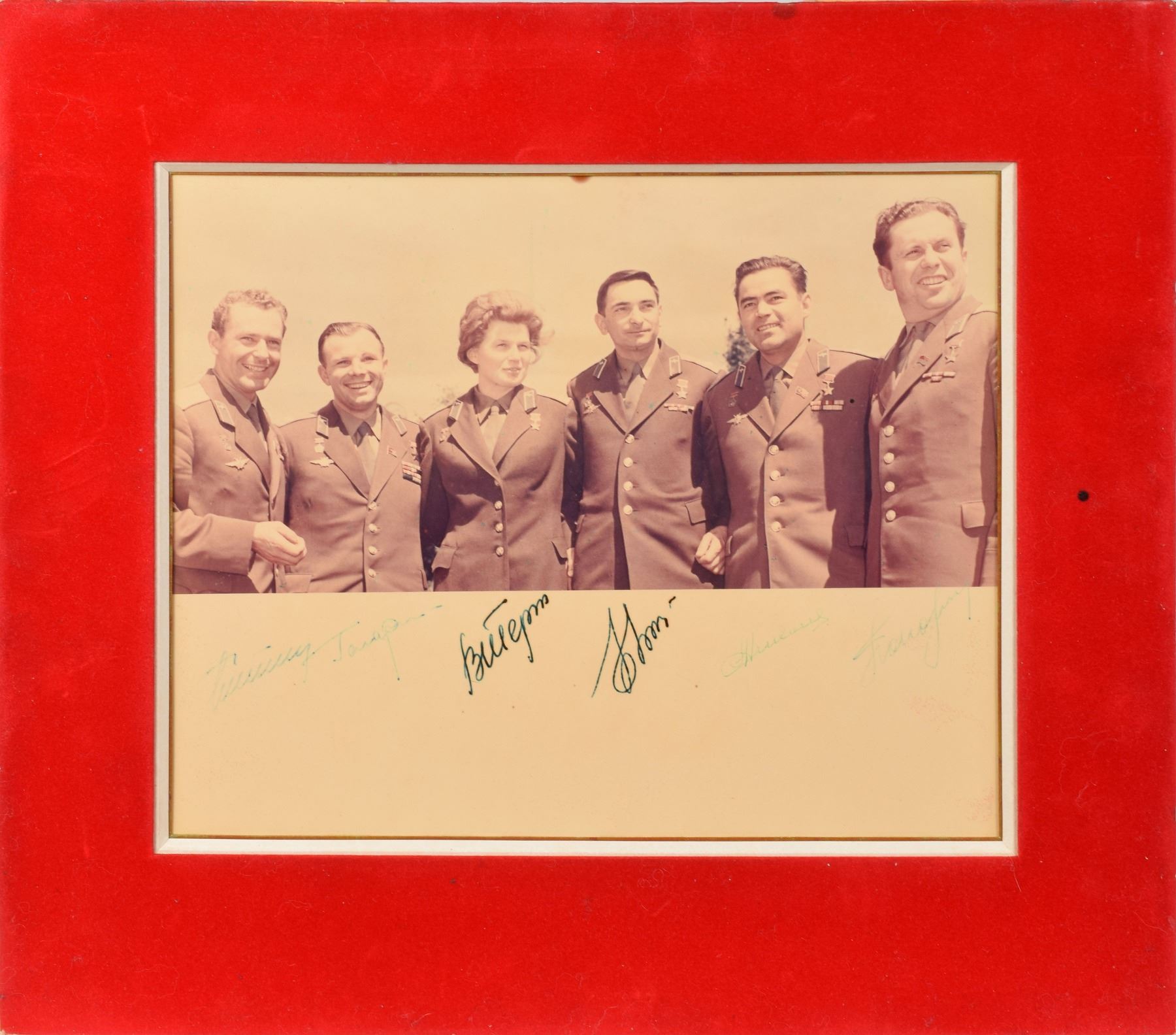 Vintage color semi-glossy 11.25 x 9 group photo of six legendary cosmonauts, signed in the lower border in various ink types by Yuri Gagarin, Gherman Titov, Andrian Nikolayev, Pavel Popovich, Valery Bykovsky, and Valentina Tereshkova. Cloth-matted to an overall size of 16 x 14. In fine condition, with some fading to the image and signatures.