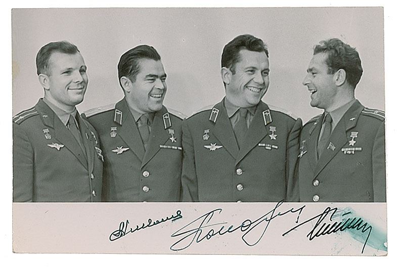 Vintage glossy 6 x 4 photo of Yuri Gagarin, Gherman Titov, Andriyan Nikolayev, and Pavel Popovich posing together in uniform, signed in ink by the latter three Vostok pioneers. In fine condition, with smudging to Titov's signature.