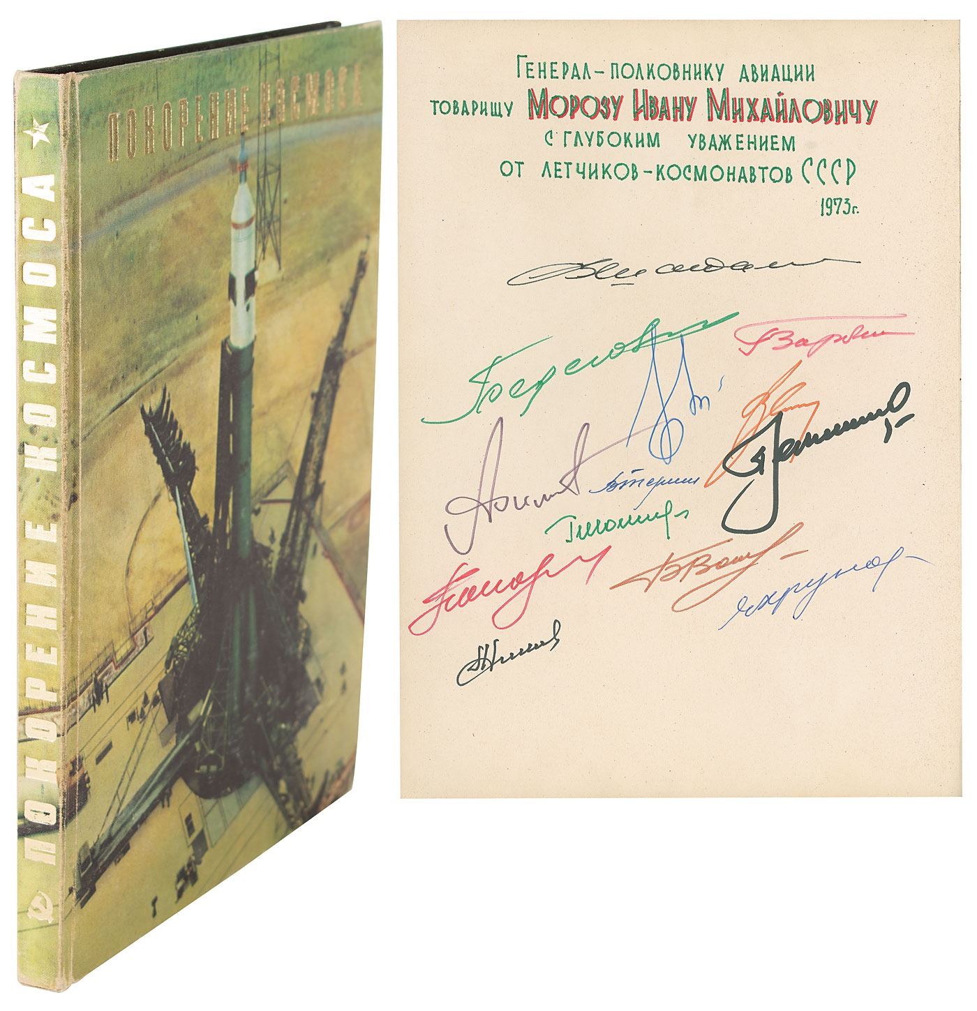 Signed book in Cyrillic: History of Space. 1972. Hardcover, 9 x 11.75, 178 pages. Signed on an opening specially prepared page in various colored felt tip by the '1973 Cosmonaut Team,' which includes: Alexei Leonov, Valentina Tereshkova, Valery Bykovsky, Georgy Beregovoy, Anatoly Filipchenko, Andriyan Nikolayev, Pavel Popovich, Vladimir Shatalov, Georgy Shonin, Viktor Gorbatko, and Boris Volynov. In fine condition, with a slightly loose spine.