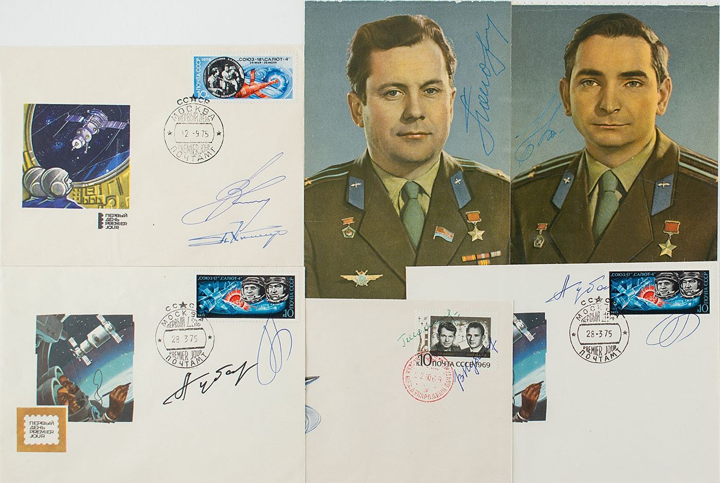 Group of six items signed by cosmonauts, including: Valery Bykovsky (SP), Pavel Popovich (SP), Georgi Shonin and Valeri Kubasov (cover), Aleksei Gubarev and Georgi Grechko (two covers), and Pyotr Klimuk and Vitali Sevastyanov (cover). In overall fine condition, with creasing along the top edges of the postcard photos of Bykovsky and Popovich.