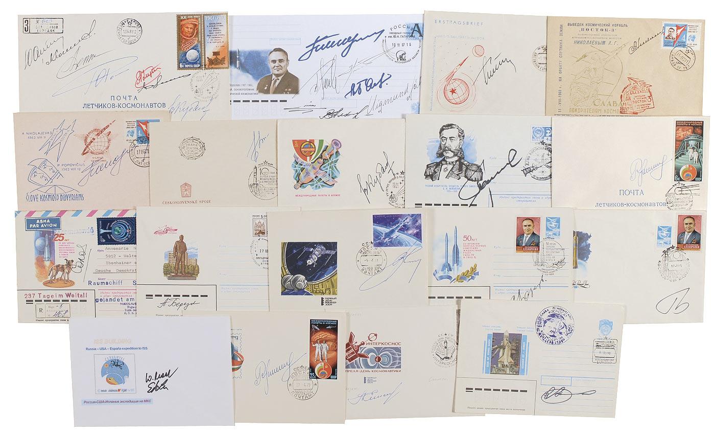 Eighteen commemorative Russian postal covers, ranging in size from 6.25 x 4.5 to 8.5 x 4.5, each signed in ink by one or more cosmonaut. Signers are: German Titov, Andrian Nikolaev, Pavel Popovich, Valery Bikovsky, Alexey Leonov, Valery Kubasov, Nikoly Rukavishnikov (2), Vladimir Solovyov, Anatoly Berezovoy, Vitaly Sevastyanov, Vasily Lazarev, Georgy Grechko, Alexey Yeliseyev, and Alexander Viktorenko. Accompanied by a cover signed by Yuri Malenchenko and Ed Lu, a cover signed by Artyukhin, Popov, Demin, Romanenko, Kizim, Dzhanibekov, and Kubasov, and a cover signed by Popovich, Vladimir Titov, Lyakhov, Atkov, Zigmund Jahn, Miroslaw Hermaszewski, and Abdul Mohmand. In overall fine condition, with scattered light wear.