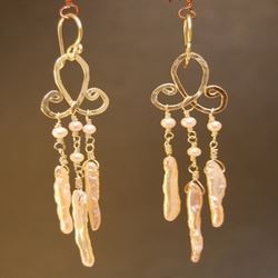 Metal: RoseGoldPink biwa pearls on hammered curled wire, about 2-1/2" long Available in either 14K gold-filled, rose gold-filled, or sterling silver. All jewelry is entirely handmade in our studio in New York.