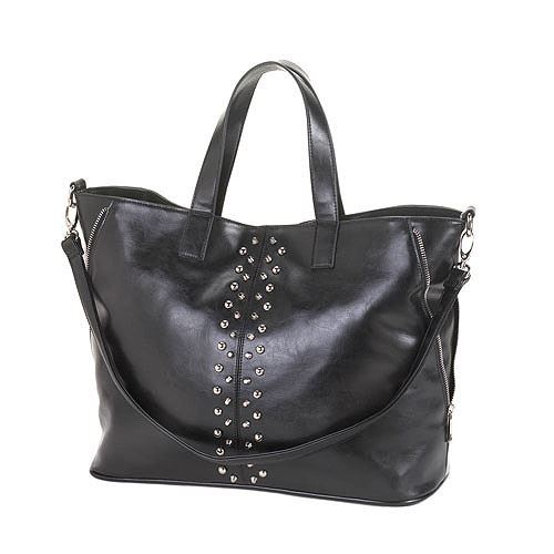 Cosmopolitan Tote Bag **|**|** Take the expressway to undeniable style with this gorgeous tote on your arm. The black leatherette construction, oversize design, and stud detailing will make this your go-to bag for day and night. Item weight: 1.2 lbs. 17-1/2 x 6" x 17" high. Polyurethane and fabric lining."
